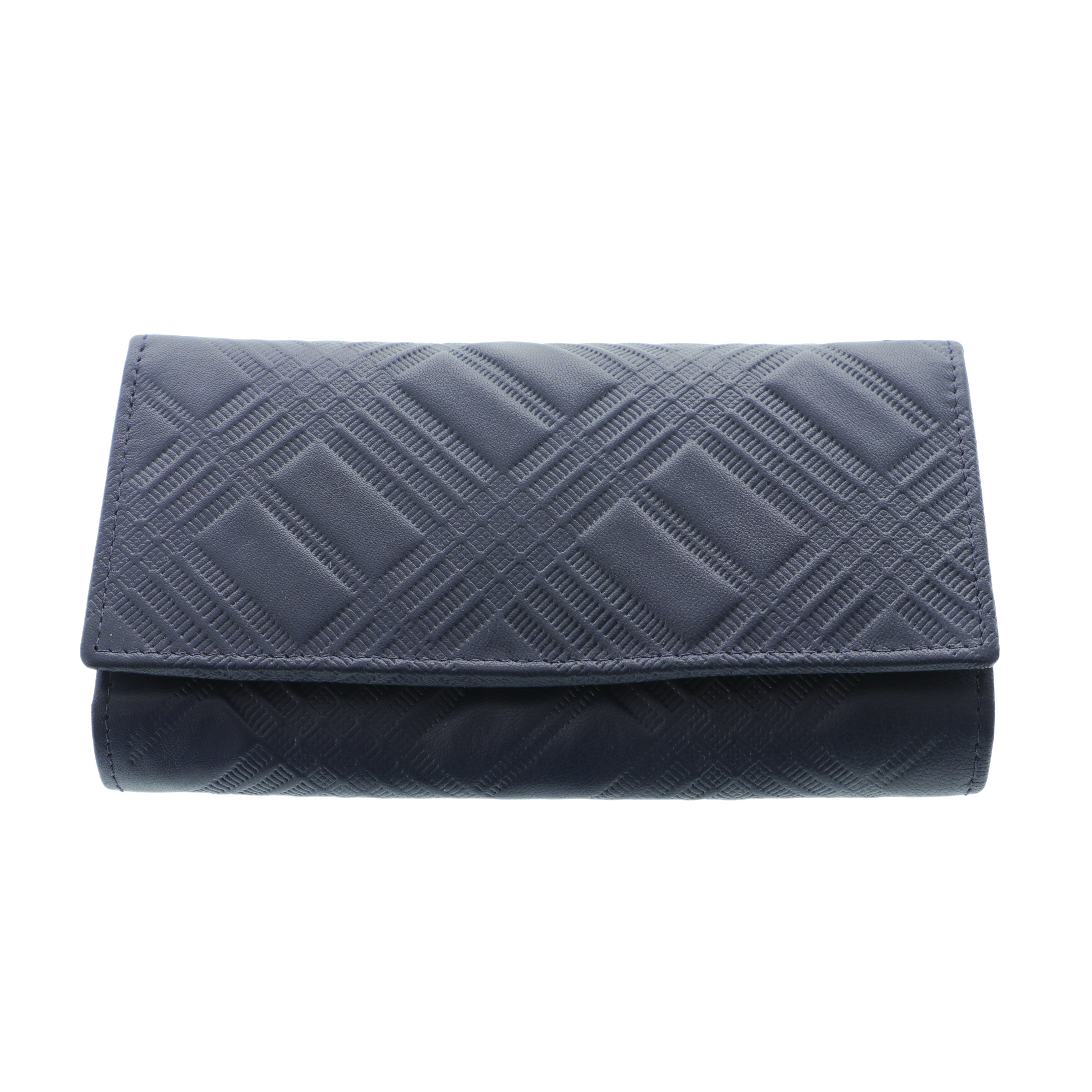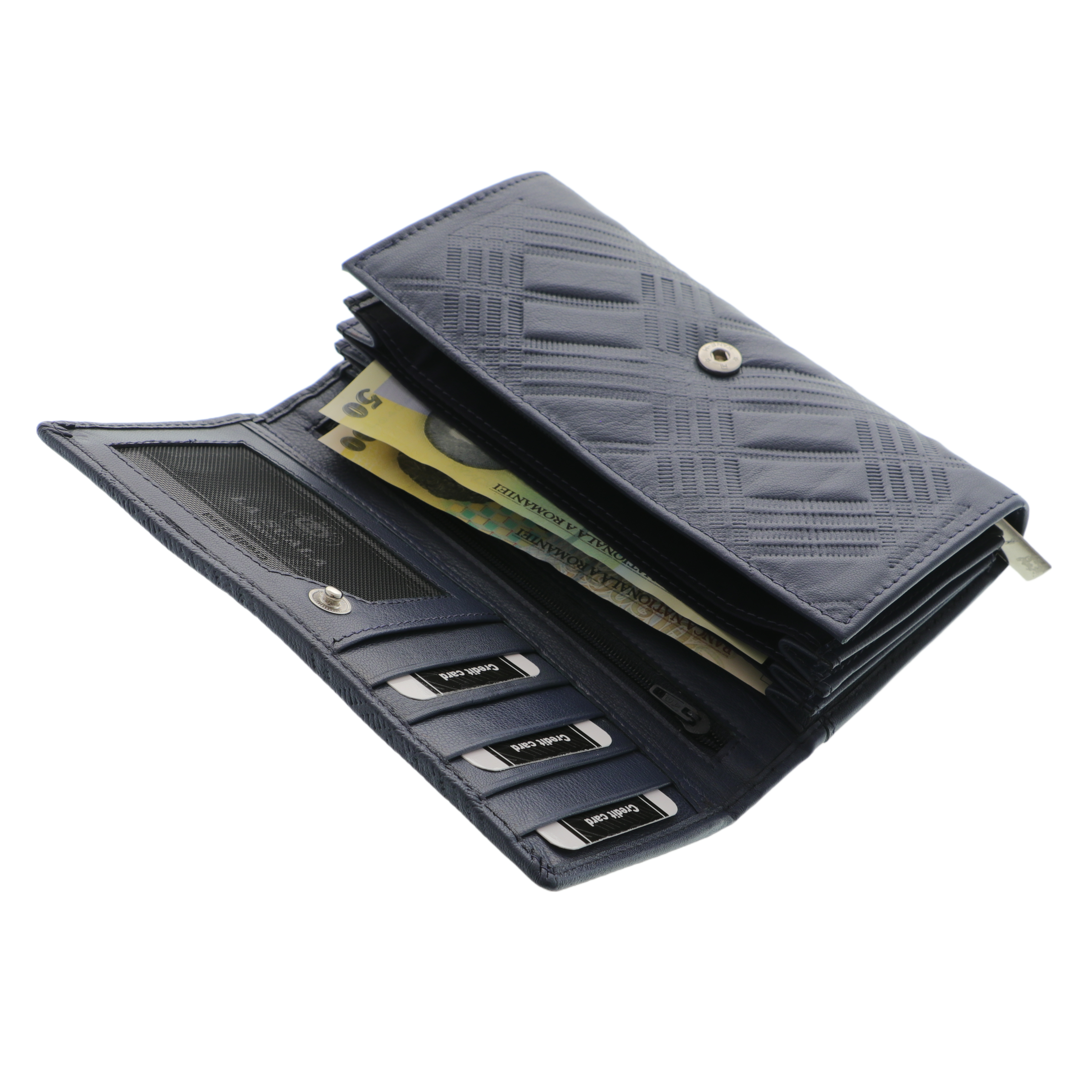 Portofelul albastru de damă Scala Luxury Collection este expresia rafinamentului și a atenției pentru detalii, un accesoriu elegant creat pentru femeile care apreciază calitatea, funcționalitatea și stilul atemporal. Realizat manual din piele naturală premium, acest portofel impresionează prin finisajele impecabile și modelul textural distinct, format din linii diagonale, care îi conferă un aspect modern și sofisticat.