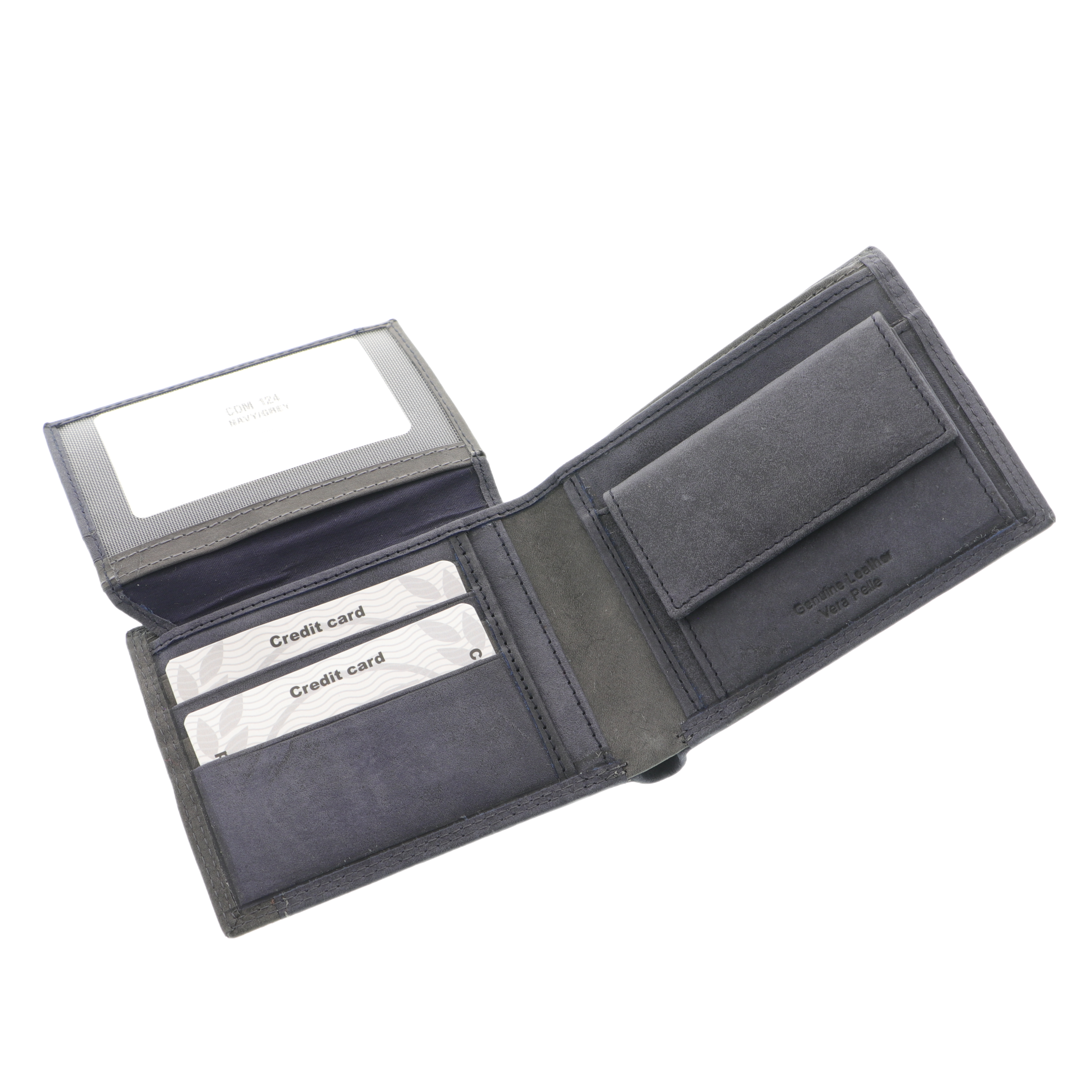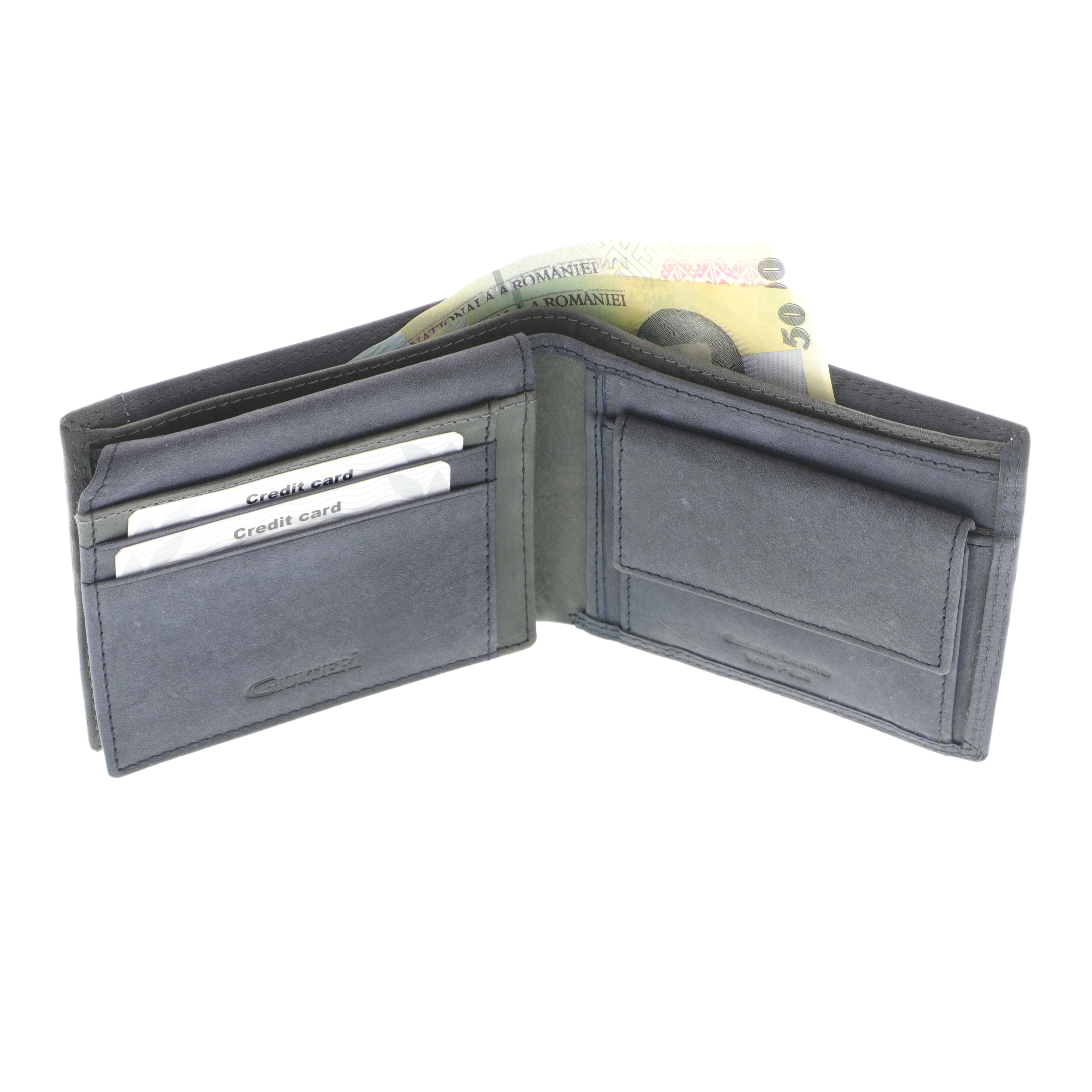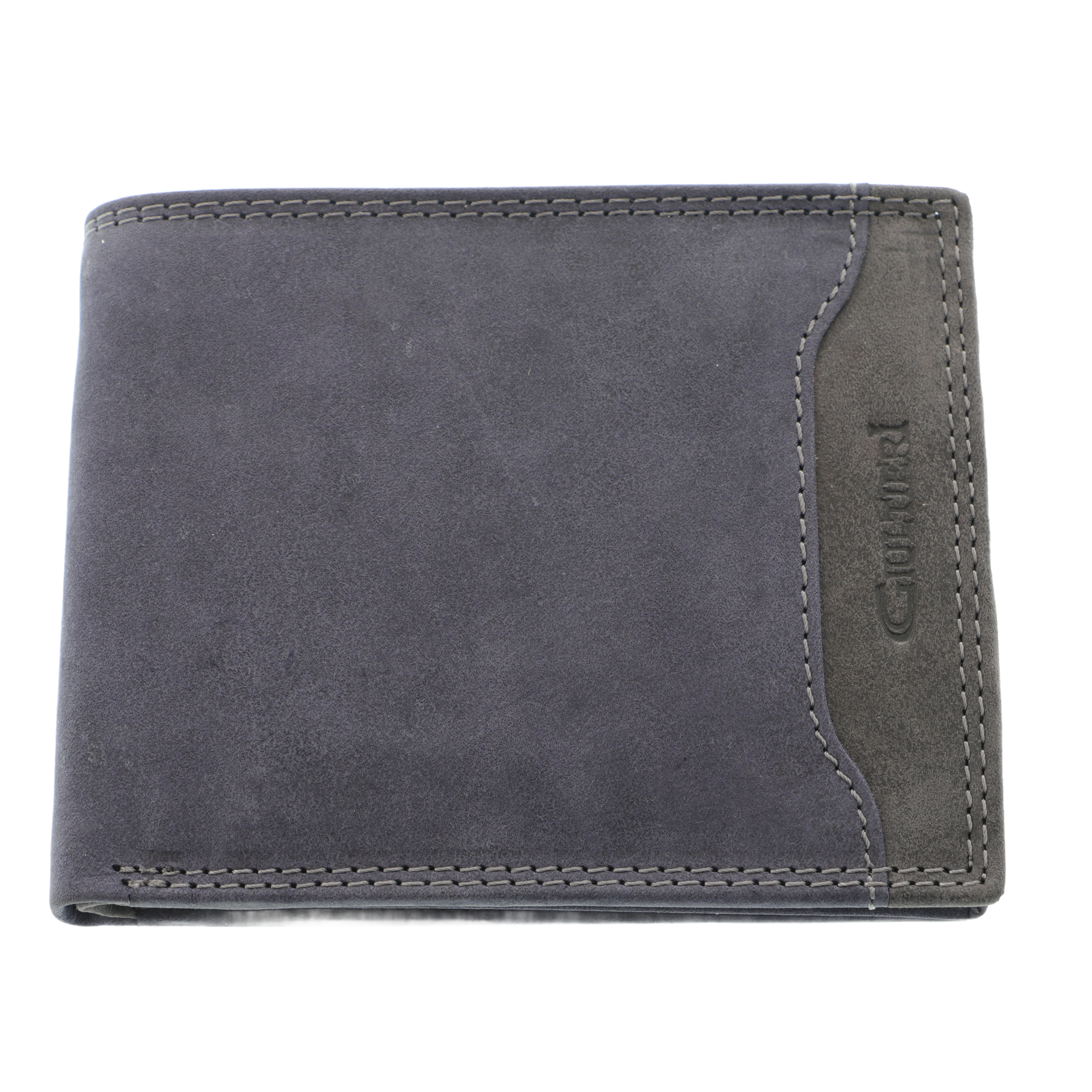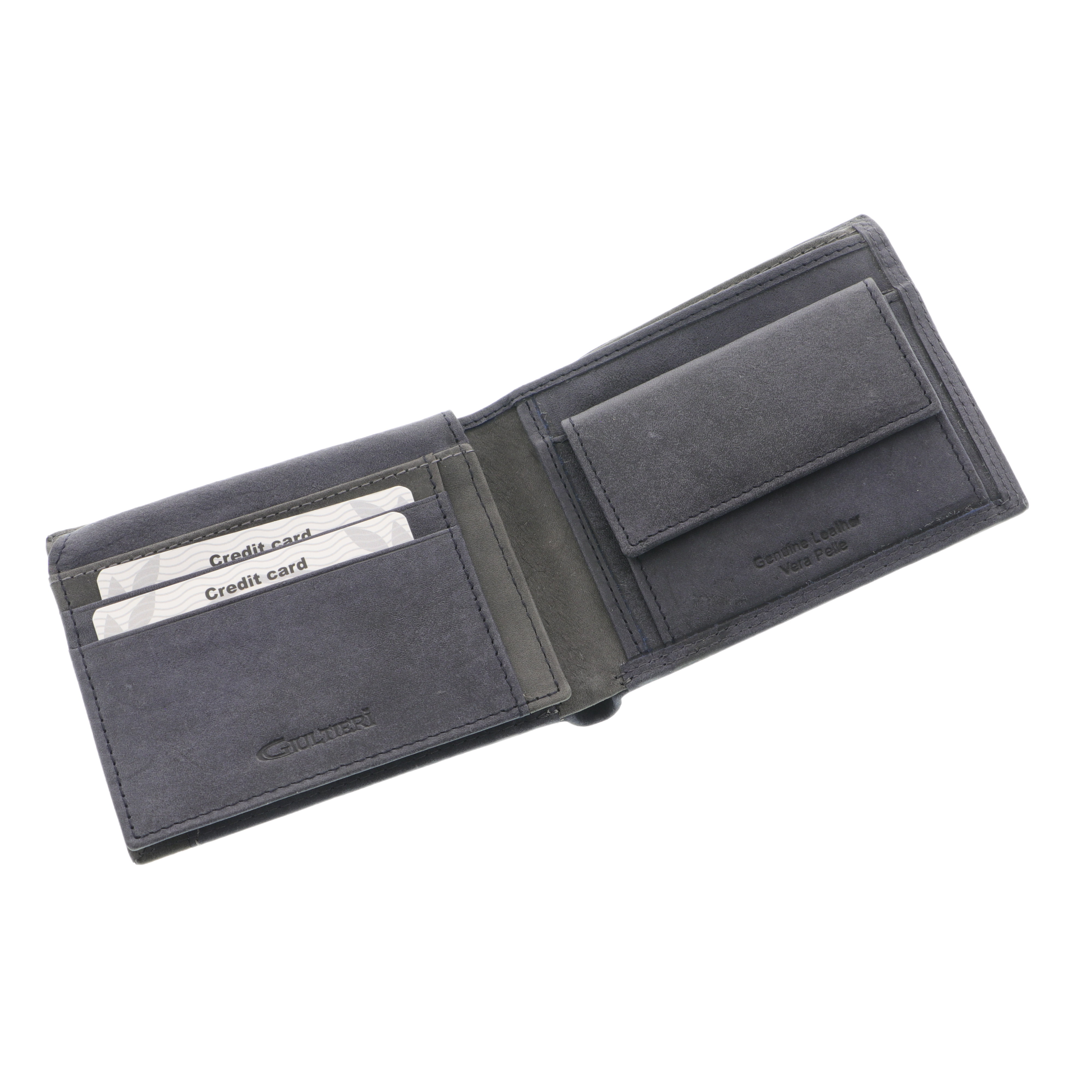 Portofelul Giultieri din piele naturală albastru cu gri, cu dimensiuni de 10 cm înălțime și 12 cm lățime, este realizat manual din piele de calitate superioară, în două nuanțe moderne. Cusăturile de întărire, în albastru închis, oferă durabilitate și un aspect rafinat.