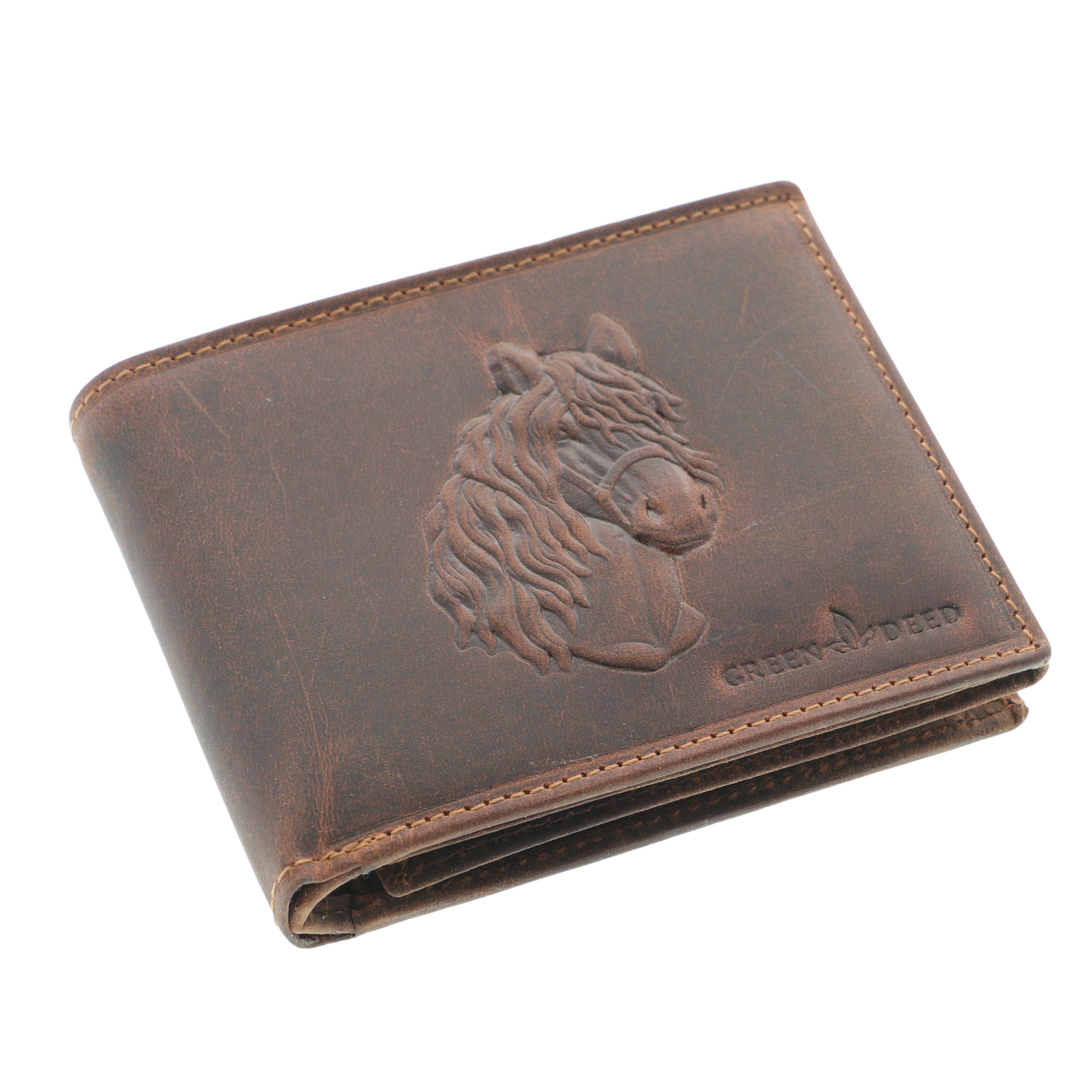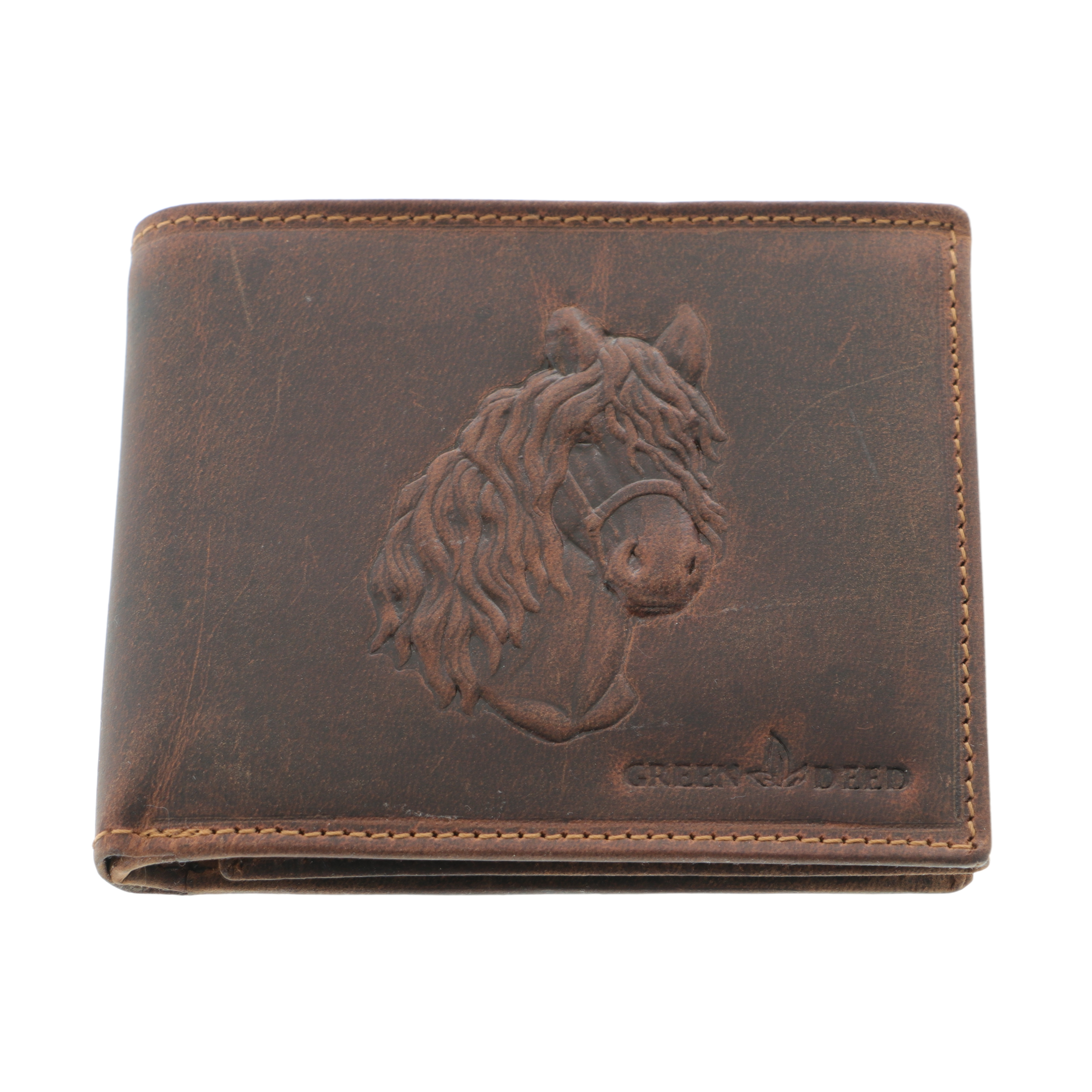Acest portofel bărbătesc din piele naturală maro este un accesoriu elegant și practic, realizat manual din piele de calitate superioară. Designul său este pus în valoare de imprimarea în relief a unui cap de cal, simbol al puterii, libertății și nobleții.