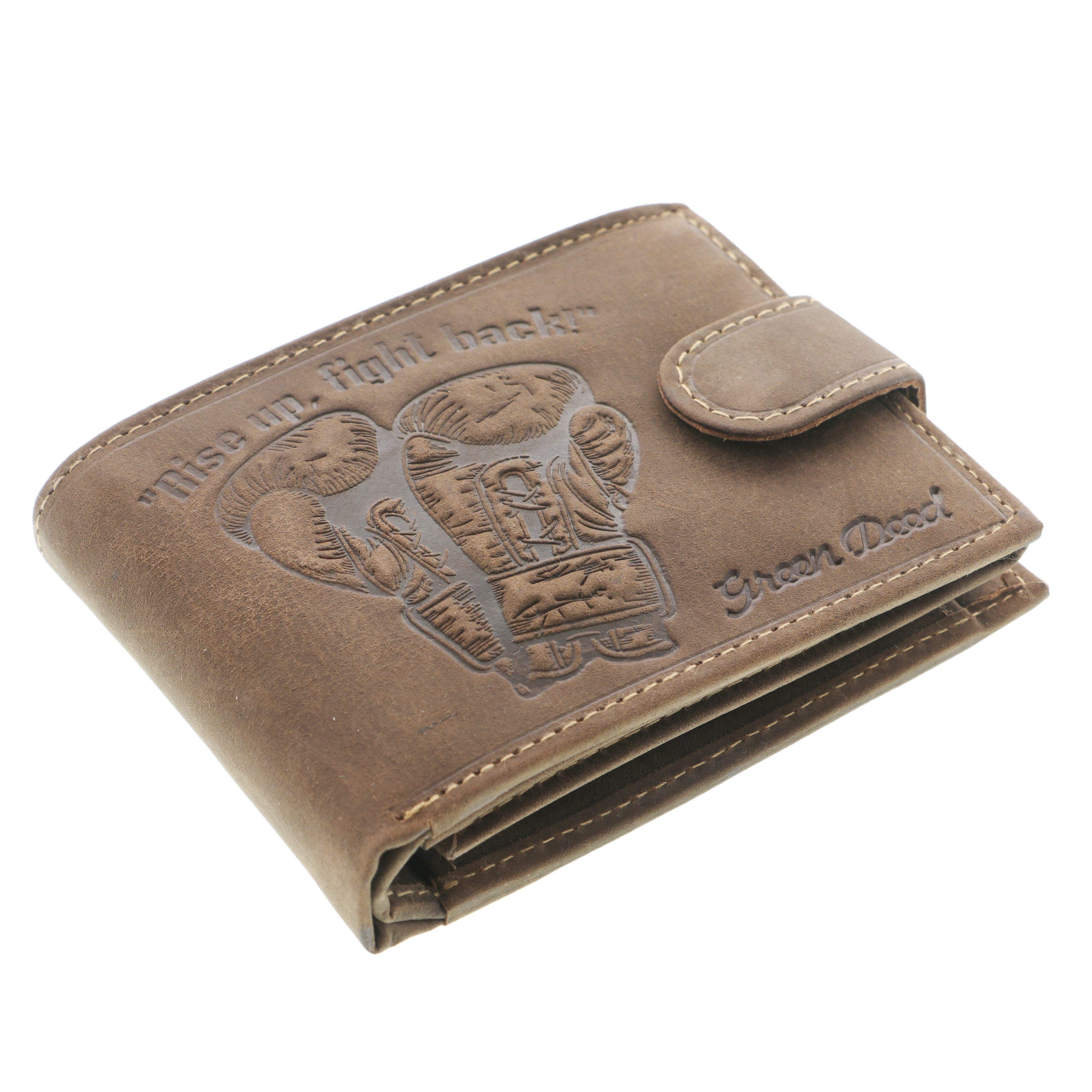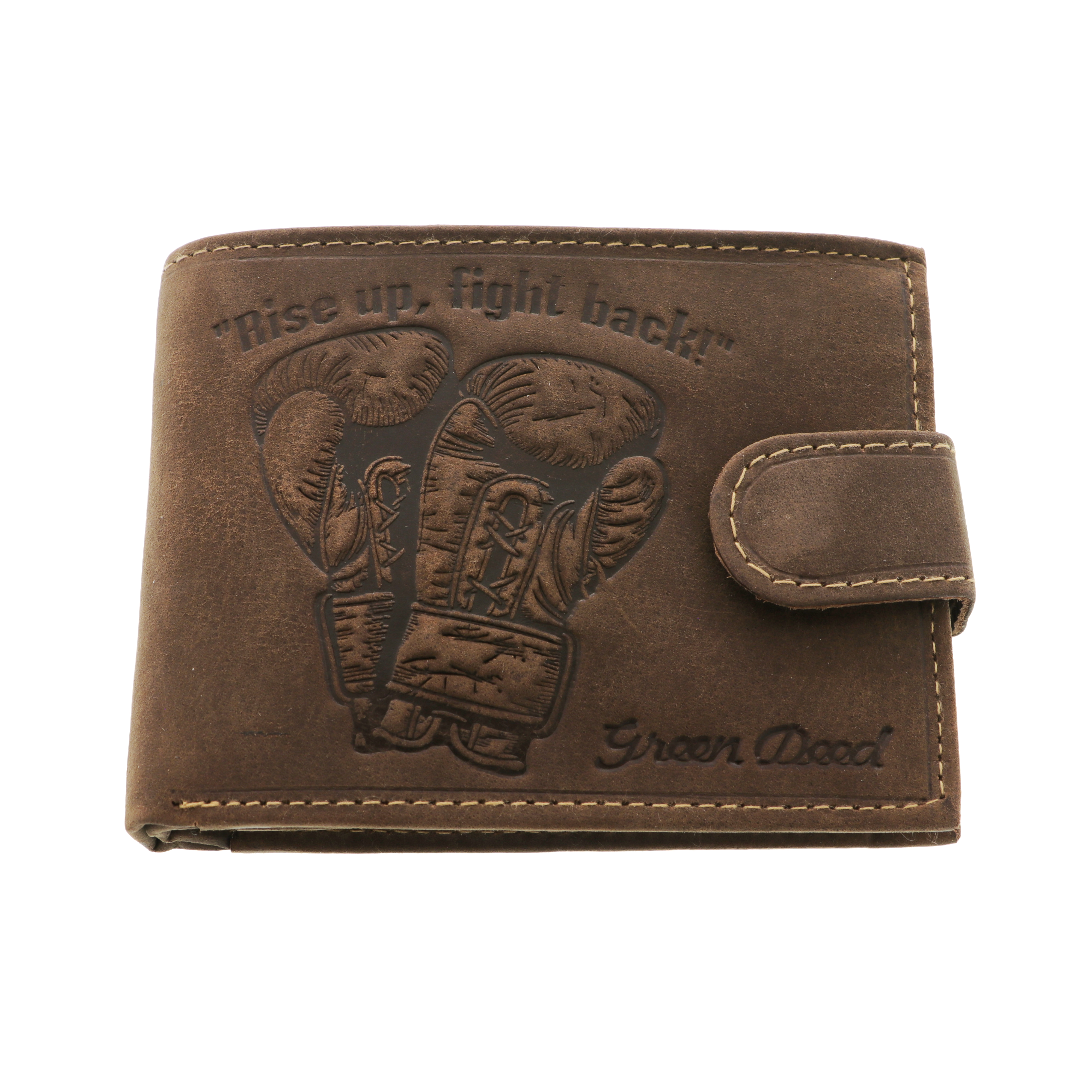 Realizat din piele naturală de cea mai bună calitate, portofelul impresionează prin designul său unic: pe partea din față se regăsesc două mănuși de box reliefate, simbol al puterii și determinării, însoțite de inscripția inspiratoare “Rise up, fight back!”. Textura fină a pielii și nuanța caldă de maro oferă un aspect sofisticat, perfect atât pentru ținutele casual, cât și pentru cele business.