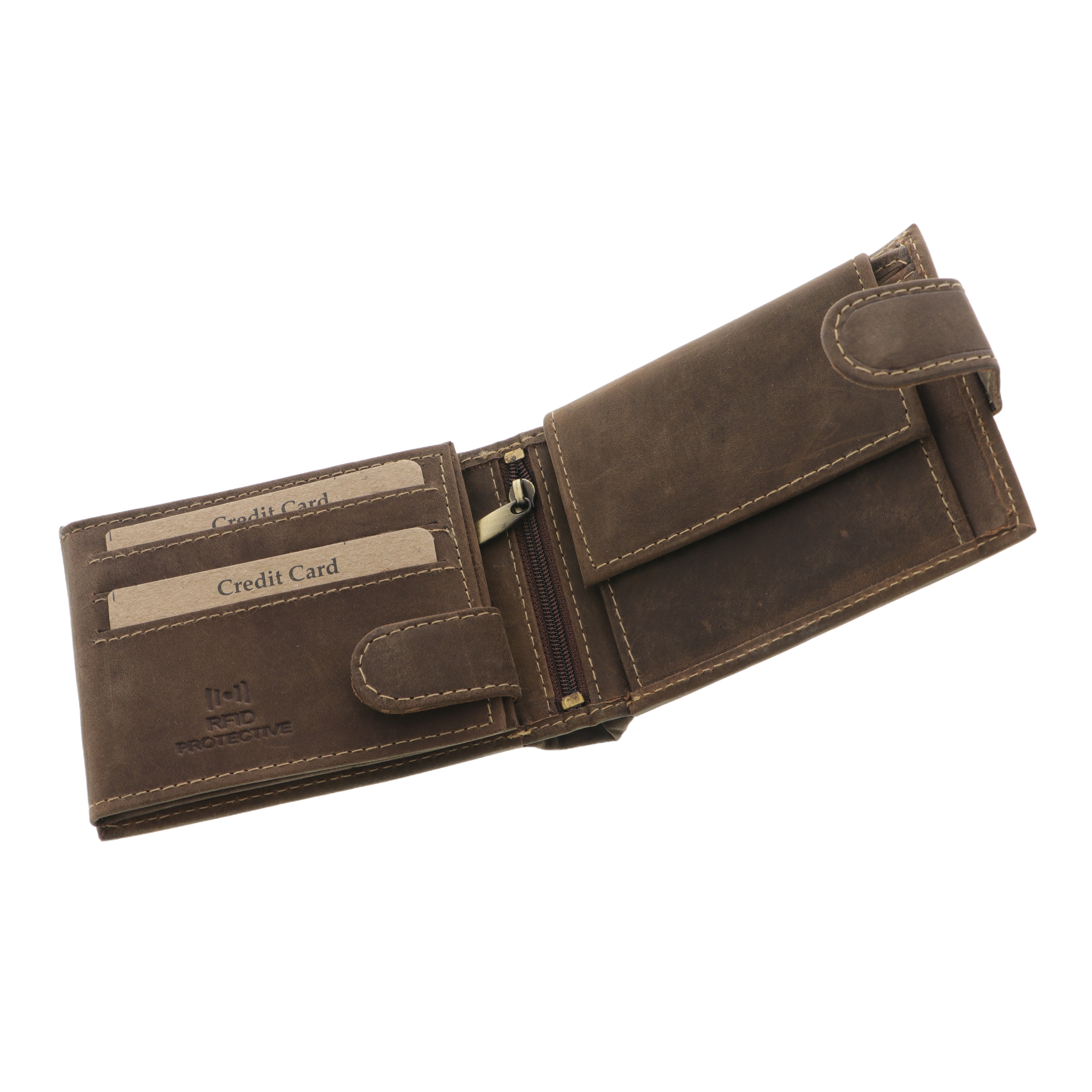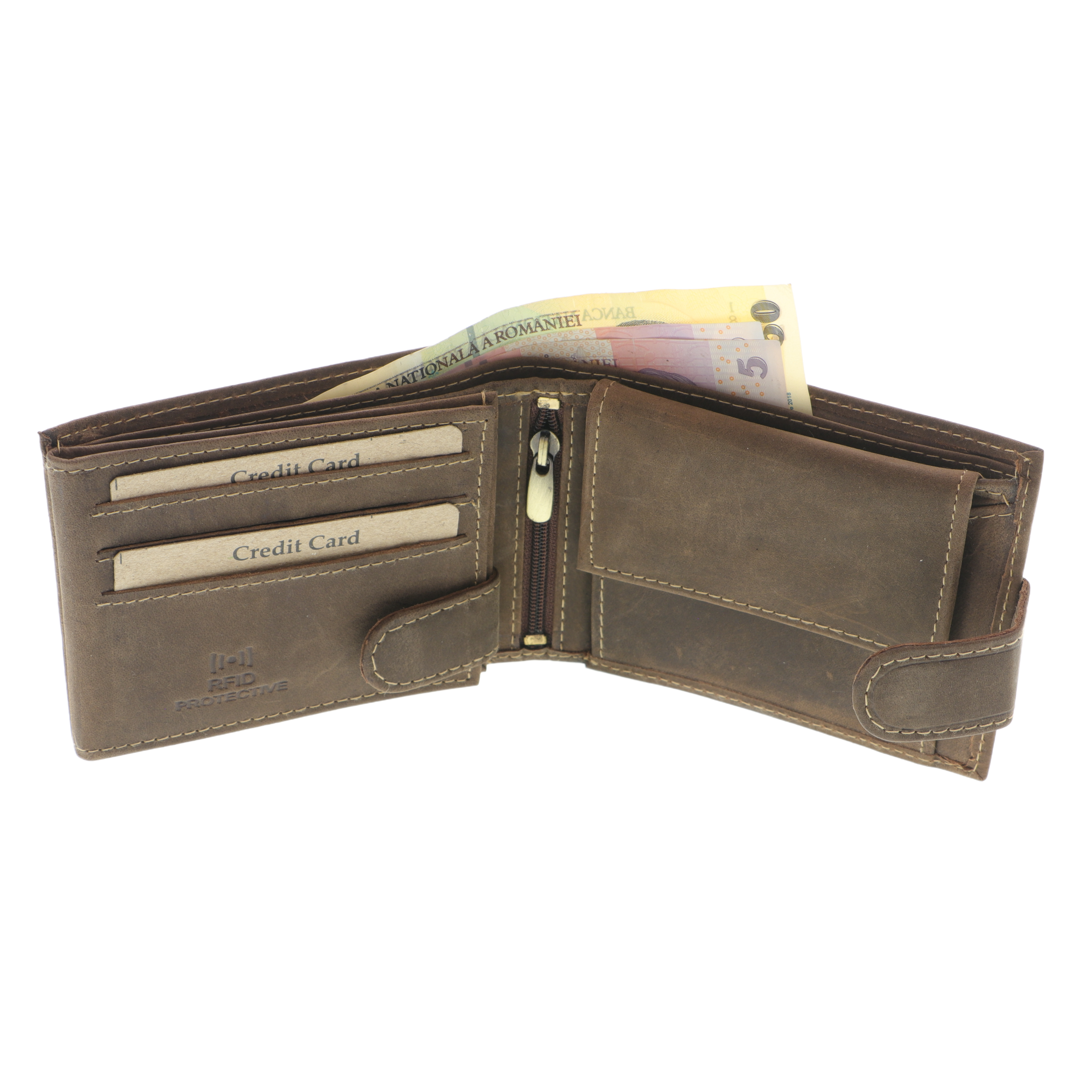 Portofelul se închide elegant cu capsă metalică, oferind protecție sporită conținutului.