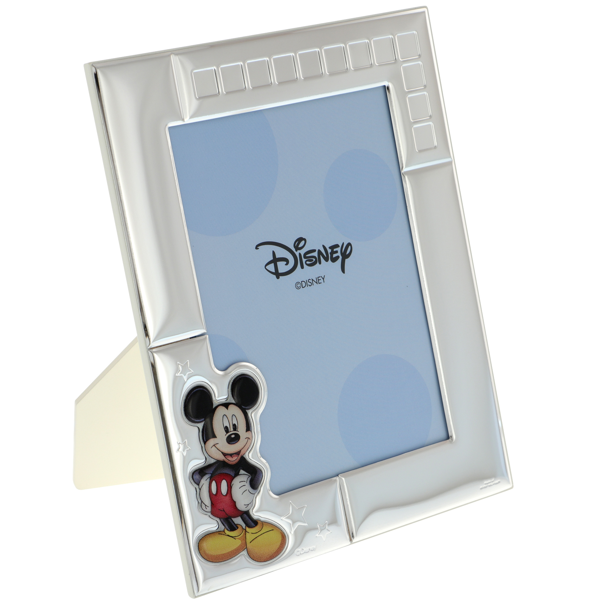 Rama foto pentru copii realizata sub licenta Disney in Italia, fiind decorata cu indragitul personaj de desene animat Mickey Mouse. Rama este realizata din metal placat cu argint pur, iar spatele si piciorul de sustinere sunt din lemn alb. Portiunea care se afla deasupra pozei poate fi personalizata cu numele copilului in limita a 12 caractere, avand loc special pentru fiecare litera in parte. Un set de caractere speciale si litere este inclus in pachet, iar diametrul lor este de cca 1 cm. Dimensiunea potrivita pentru imagine este de 13x18 cm. Rama poate purta si o placuta gravata, aplicata pe spatele ei. Dimensiuni - 20x25cm.