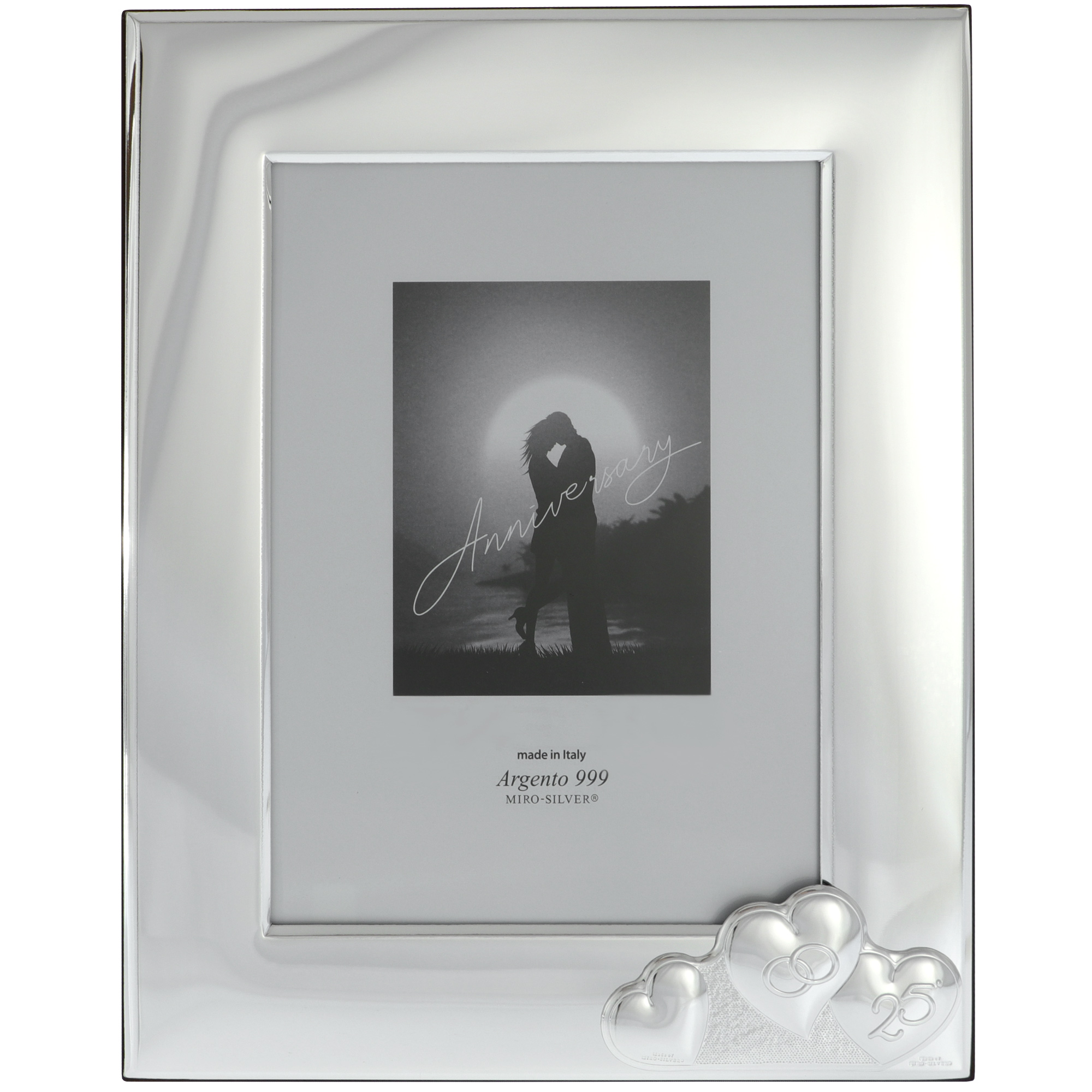 Rama foto pentru aniversarea a 25 de ani trecuti de la nunta, un cadou elegant realizat din metal placat cu argint pur. Rama decorata cu 3 inimi are finisaj argintiu lucios si in inimi apare o pereche de verighete alaturi de cifra 25. Rama are spatele din lemn de culoare wenge, avand un picior lat de sustinere. Pe spate putem aplica o placa gravata cu mesajul ales de tine. Poza potrivita pentru aceasta este de 18x24 cm, rama avand o dimensiune de 27x33 cm. Este asezata in cutie de cadouri.