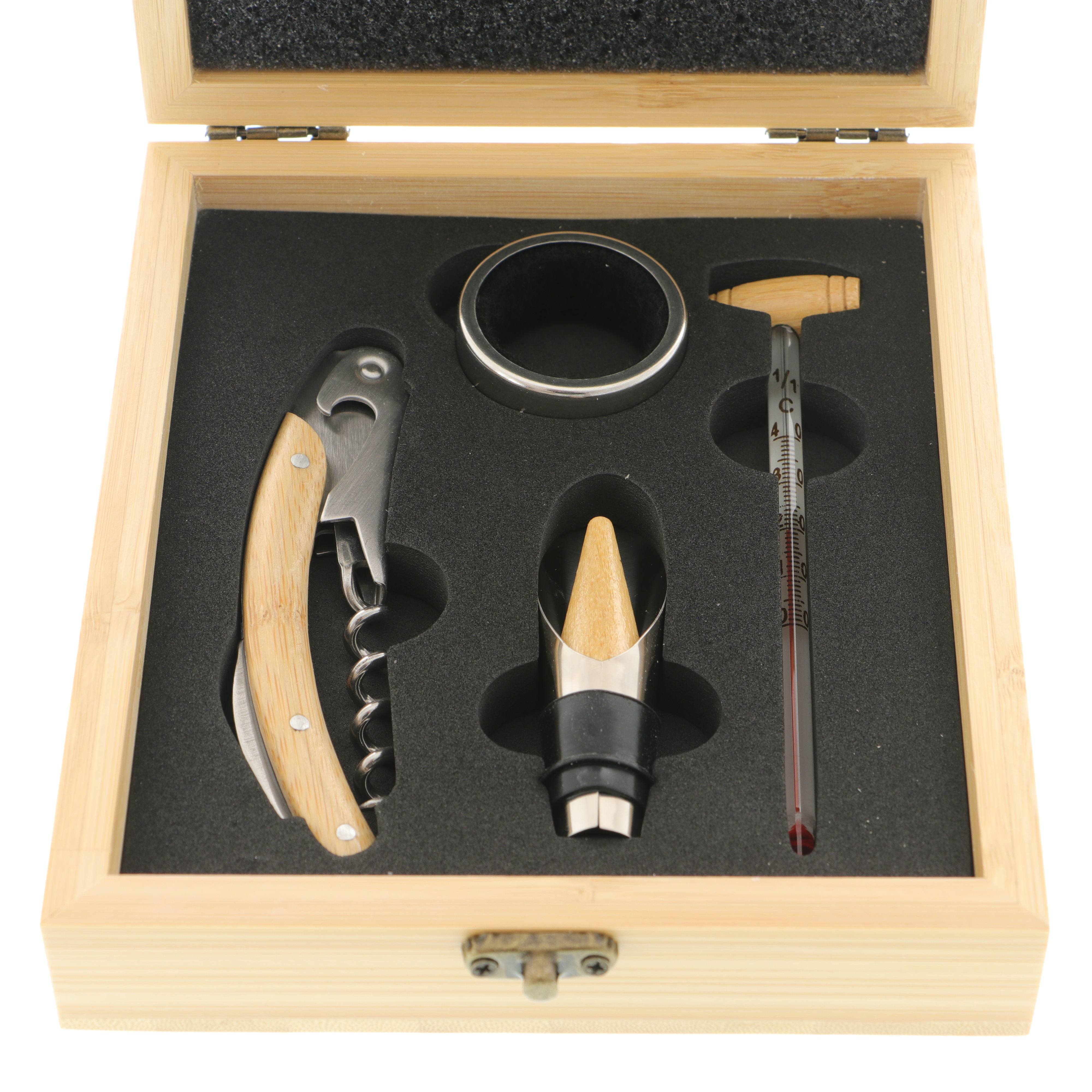 Setul de accesorii pentru vin în cutie de bambus este un cadou elegant și util, perfect pentru orice ocazie.