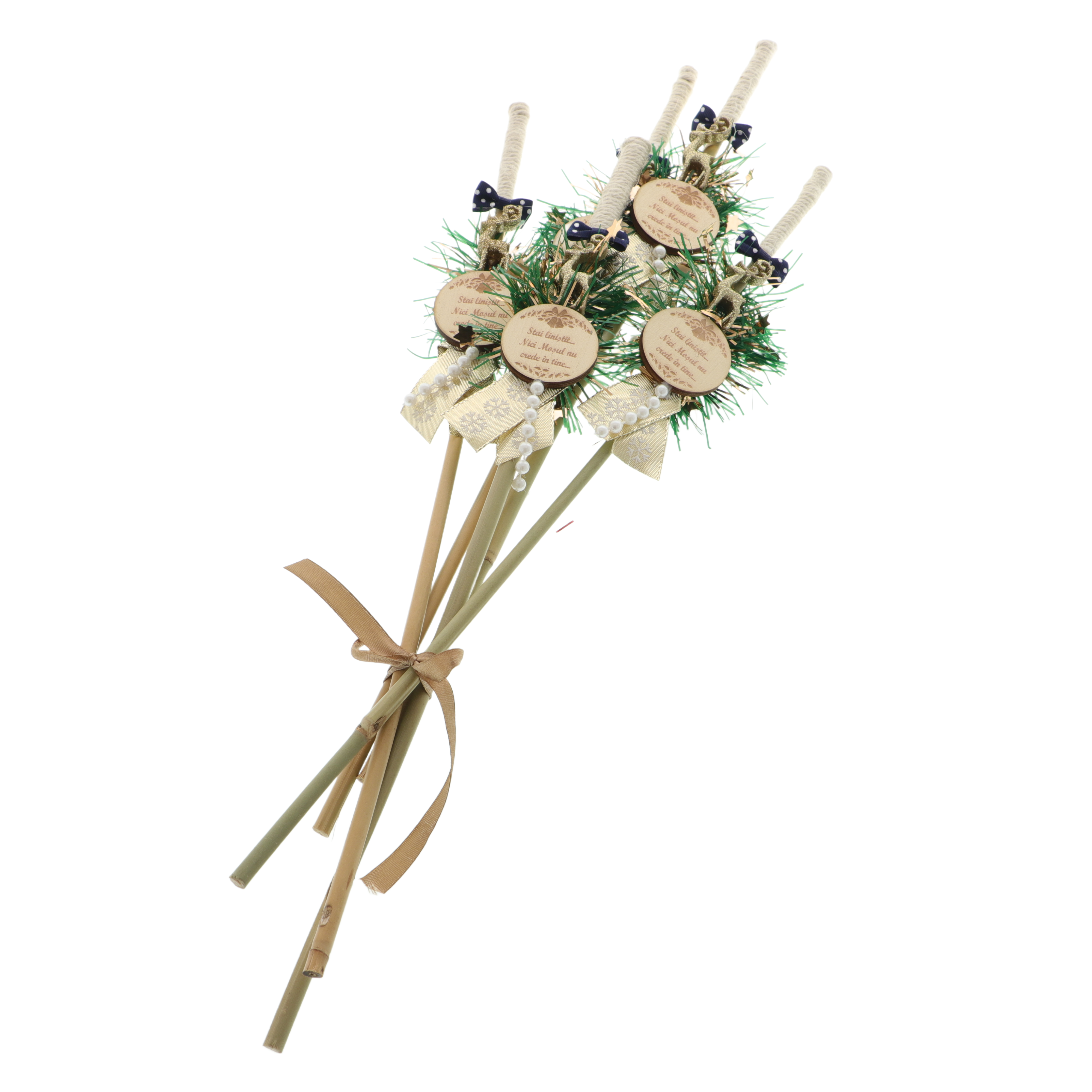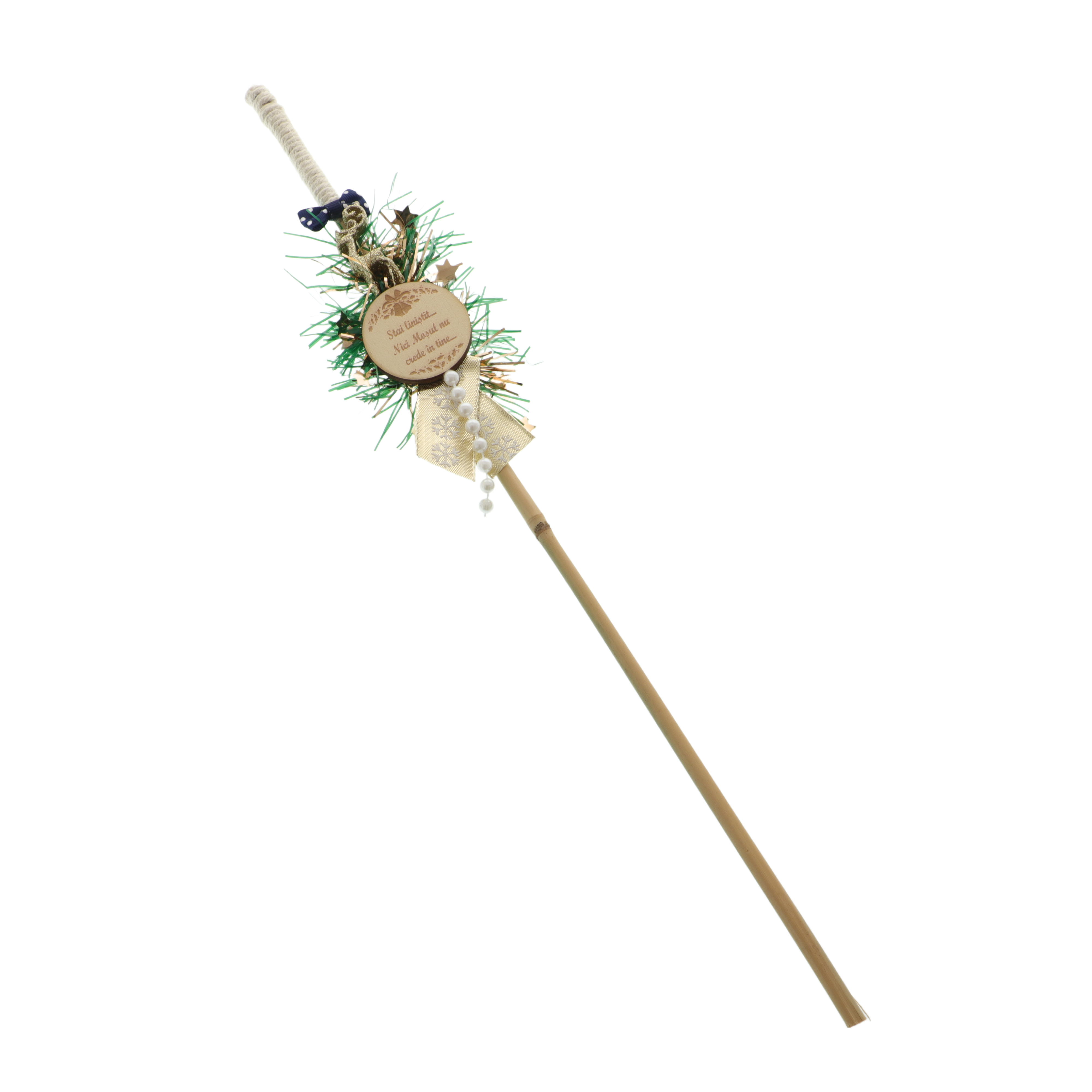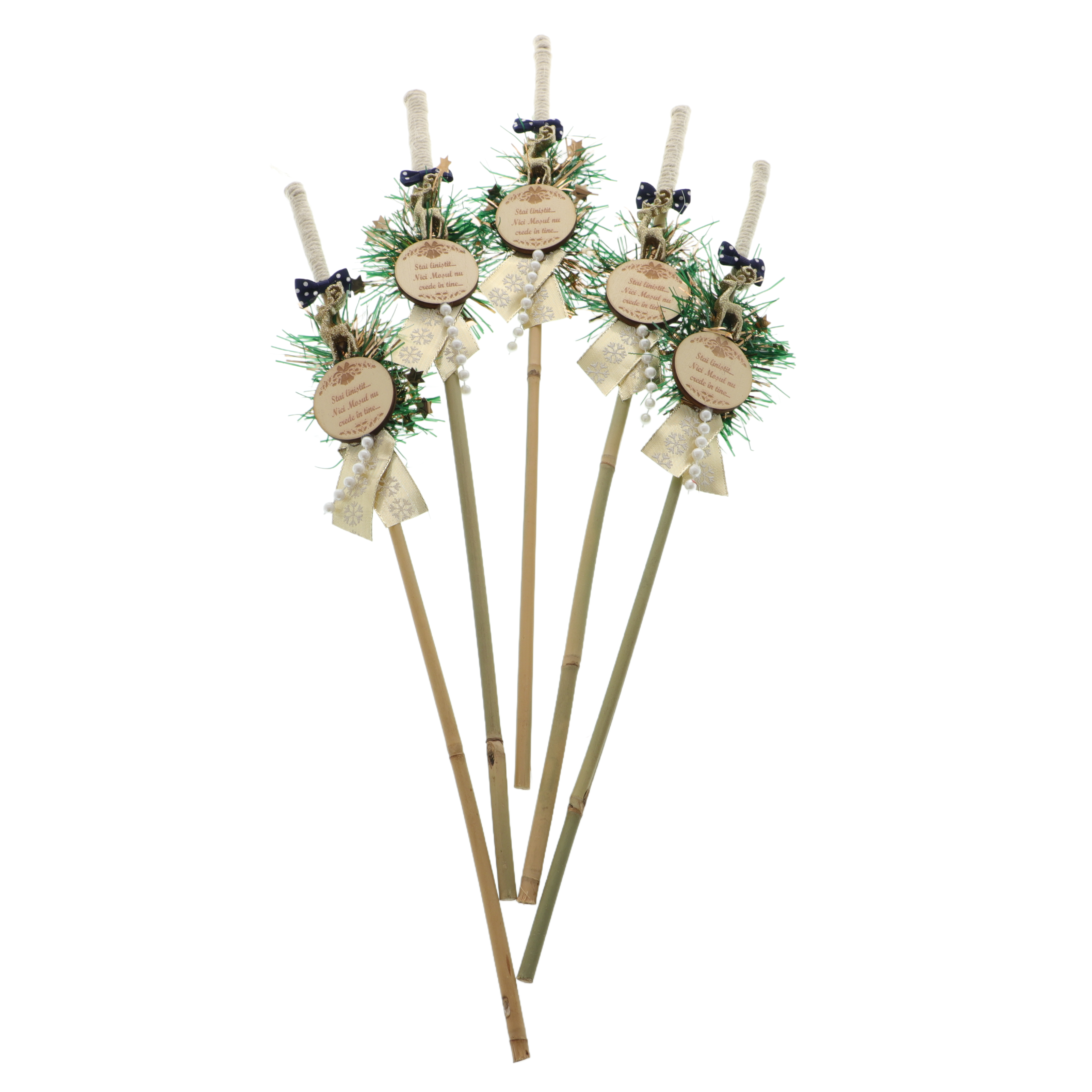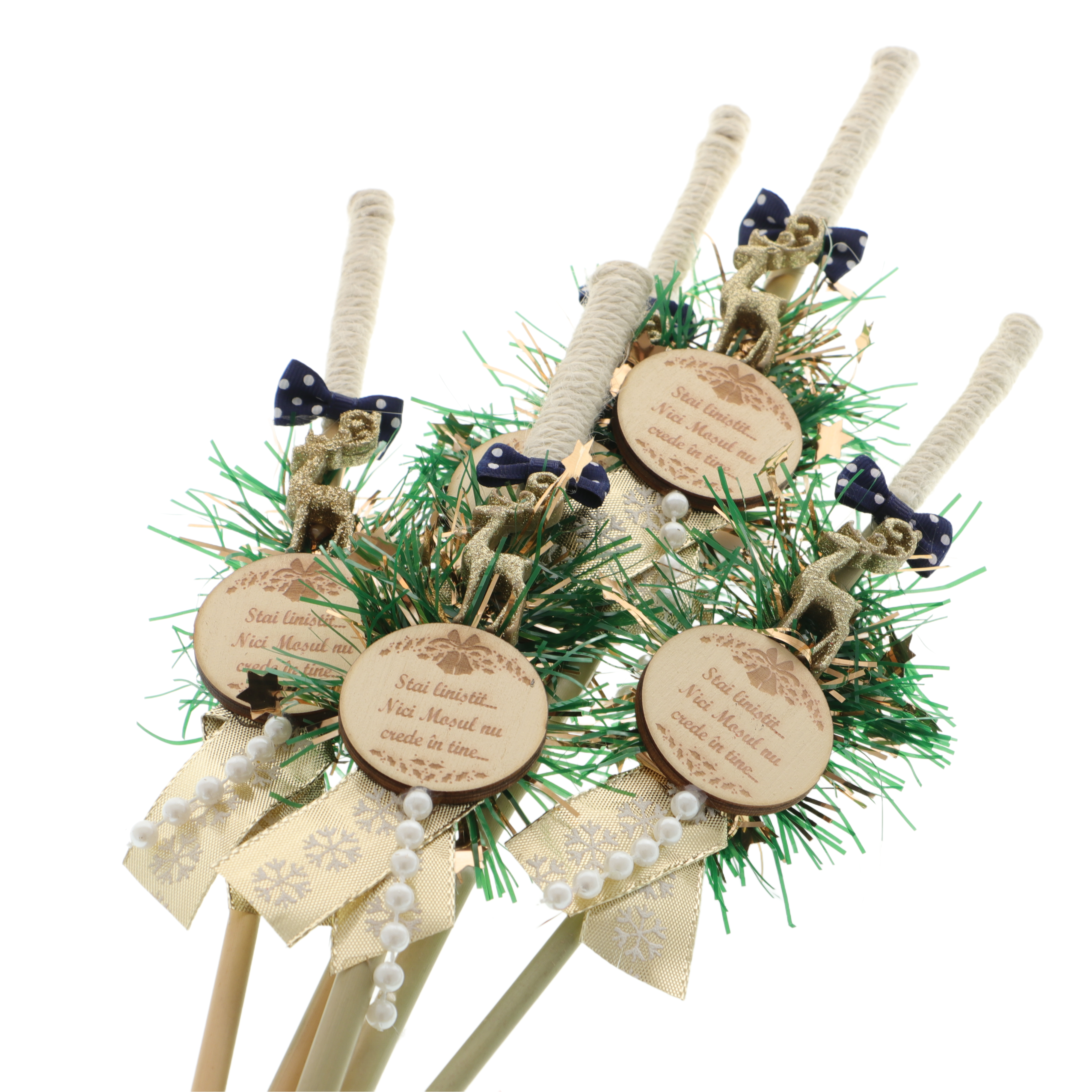 Fiecare băț are o bază din bambus natural, de aproximativ 1 cm grosime, și este decorat cu sfoară albă, beteală cu stelute, panglică decorativă, șirag de mărgele, fundiță textilă și o figurină decorativă cu ren.