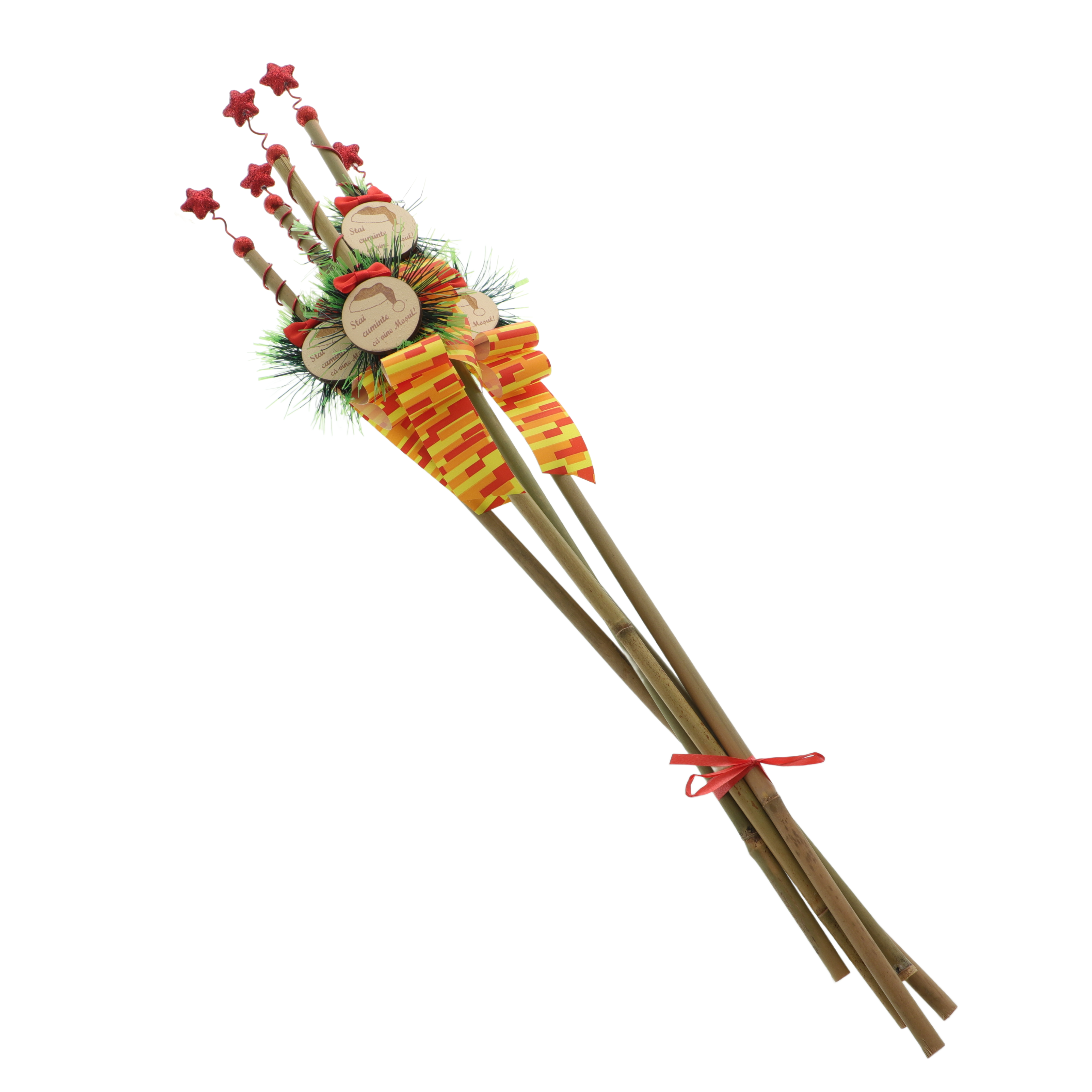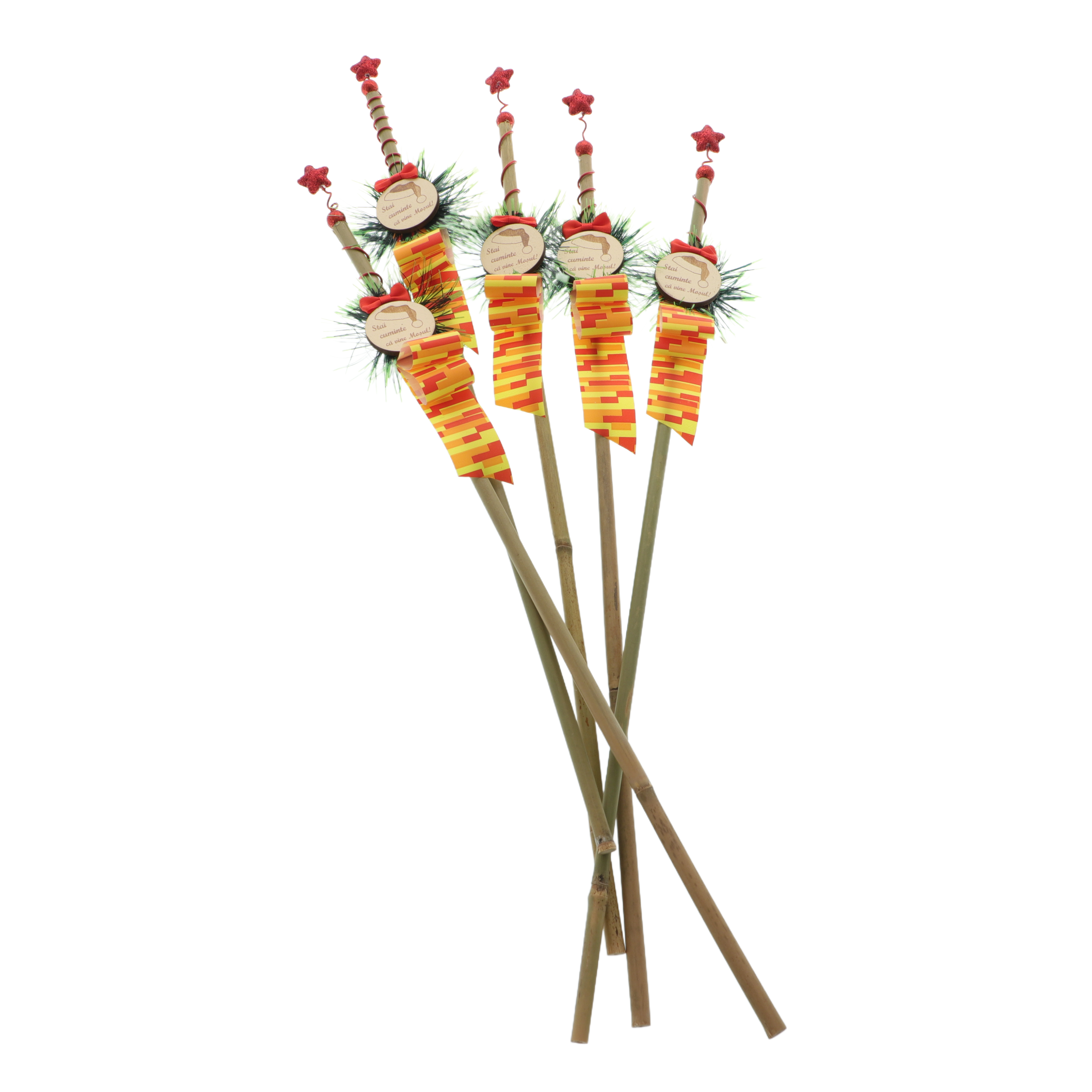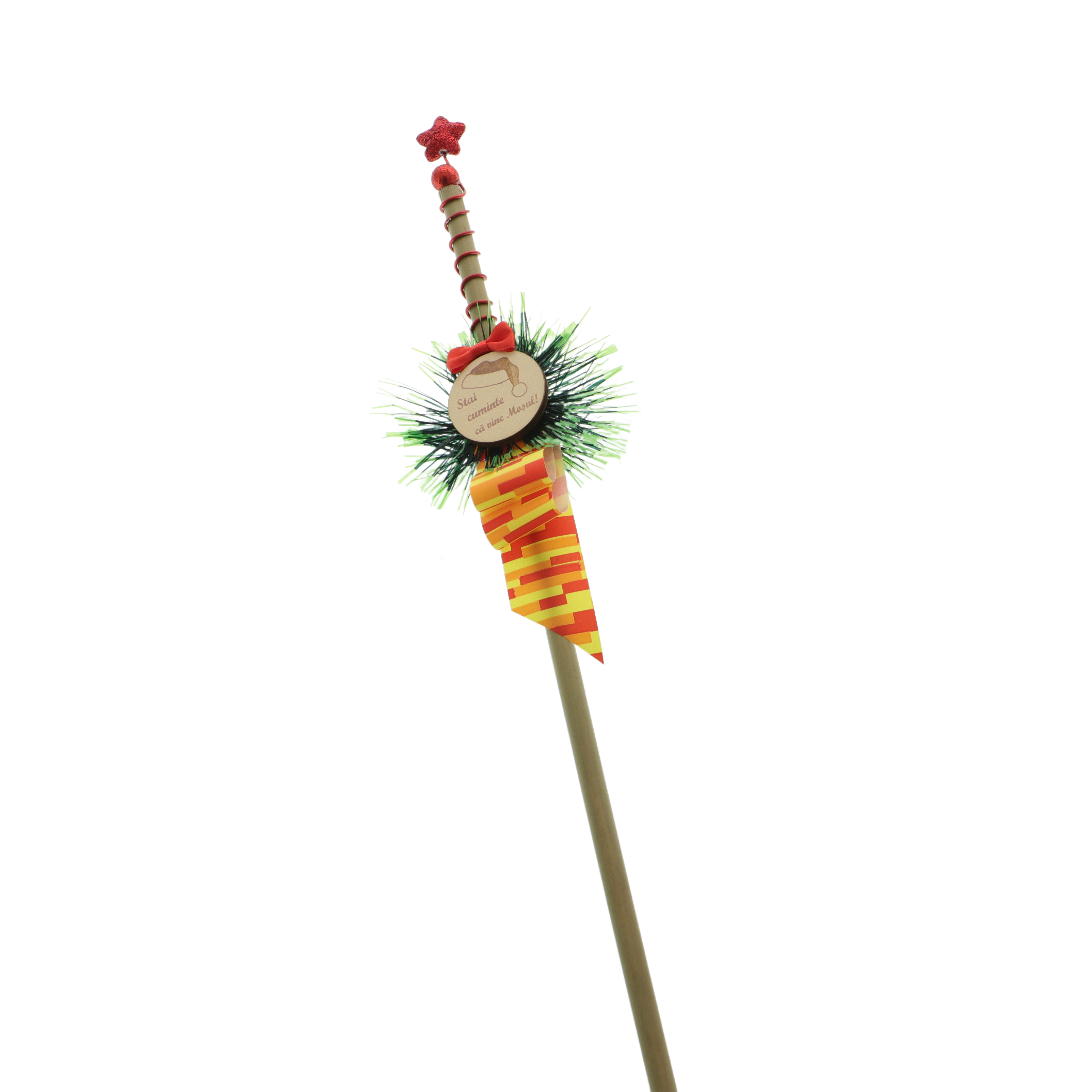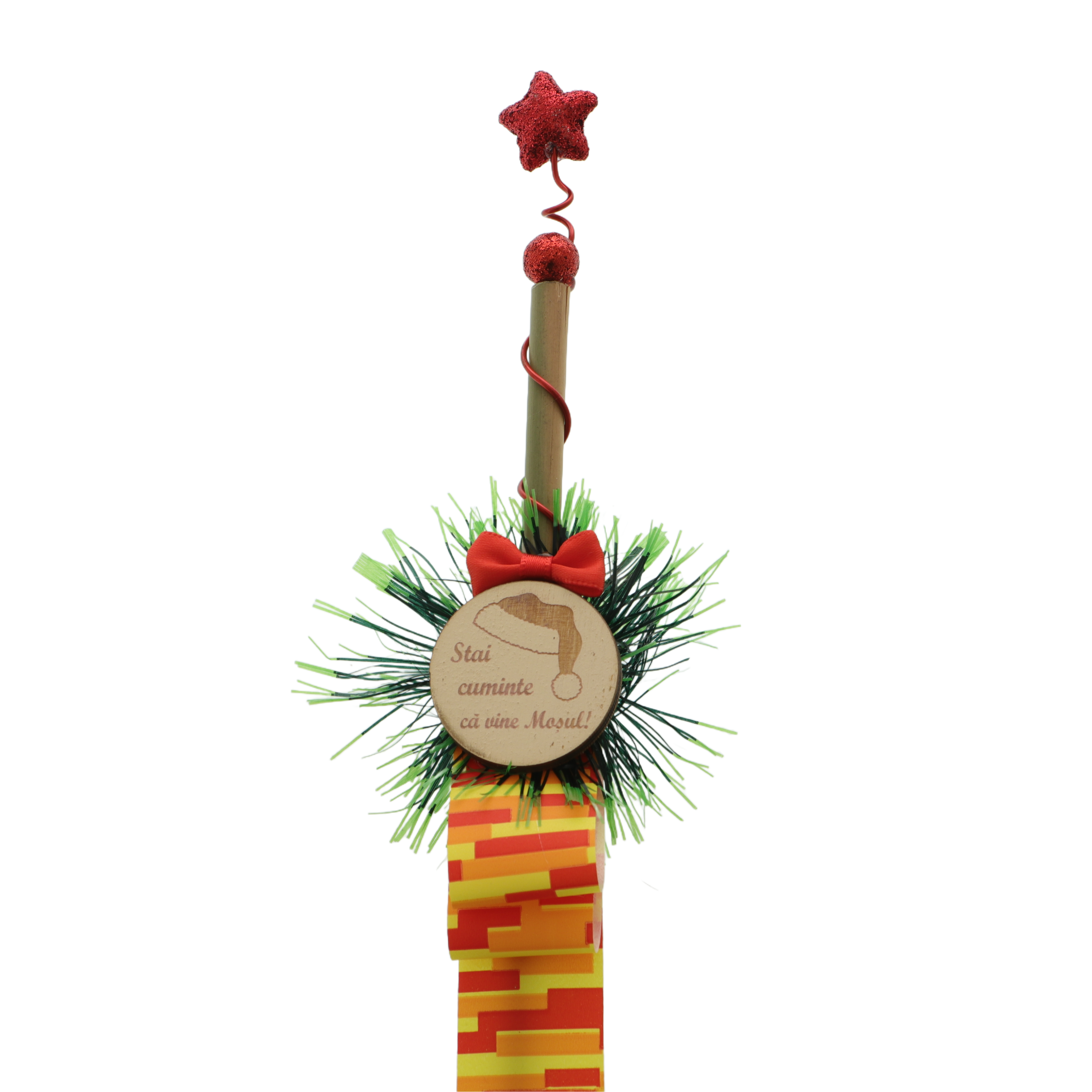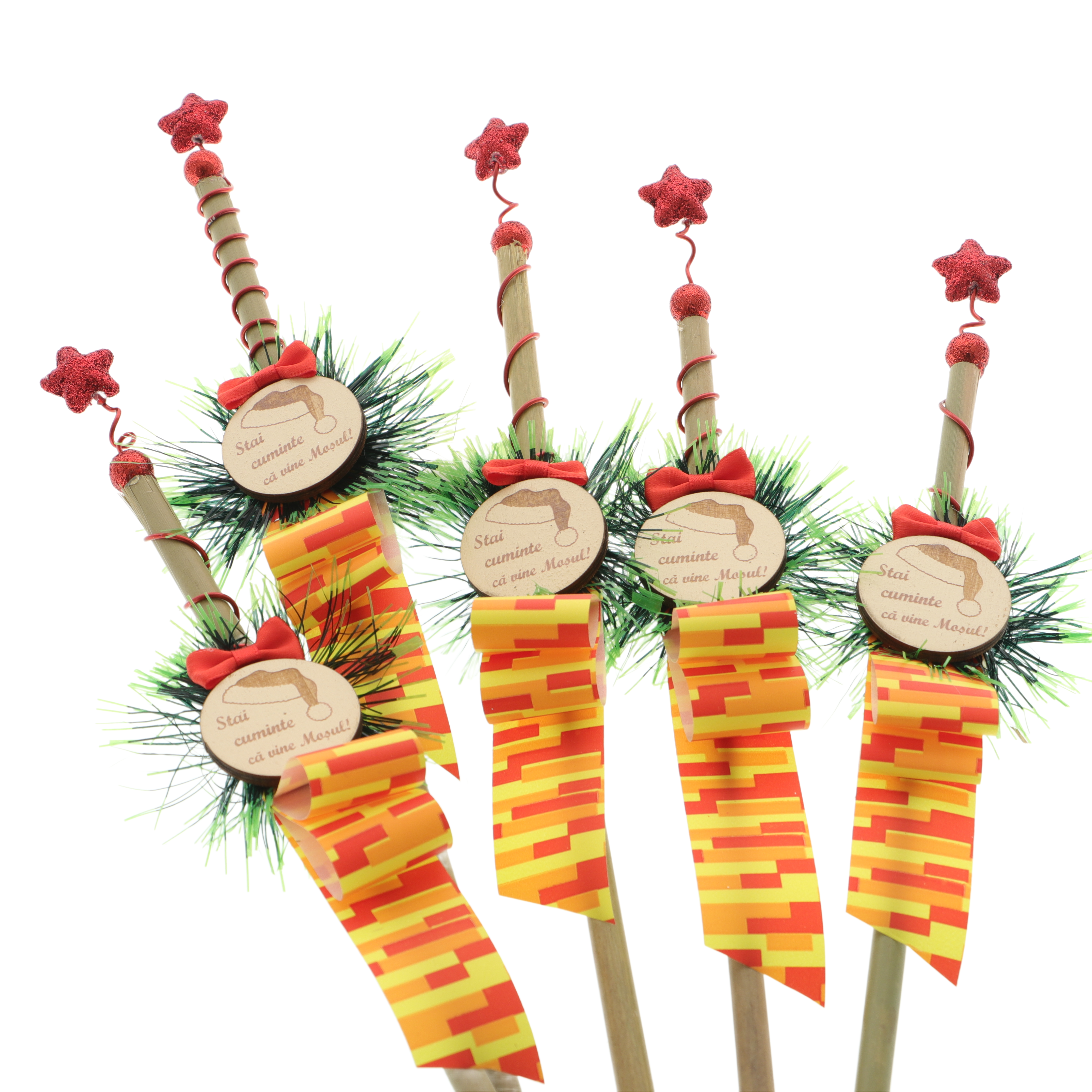 Adaugă magie și umor sărbătorilor cu Setul de 5 Bețe Moș Nicolae „Stai Cuminte”, realizate manual din bambus. Fiecare bățișor are aproximativ 55 cm lungime și este decorat cu elemente festive care atrag imediat privirea: