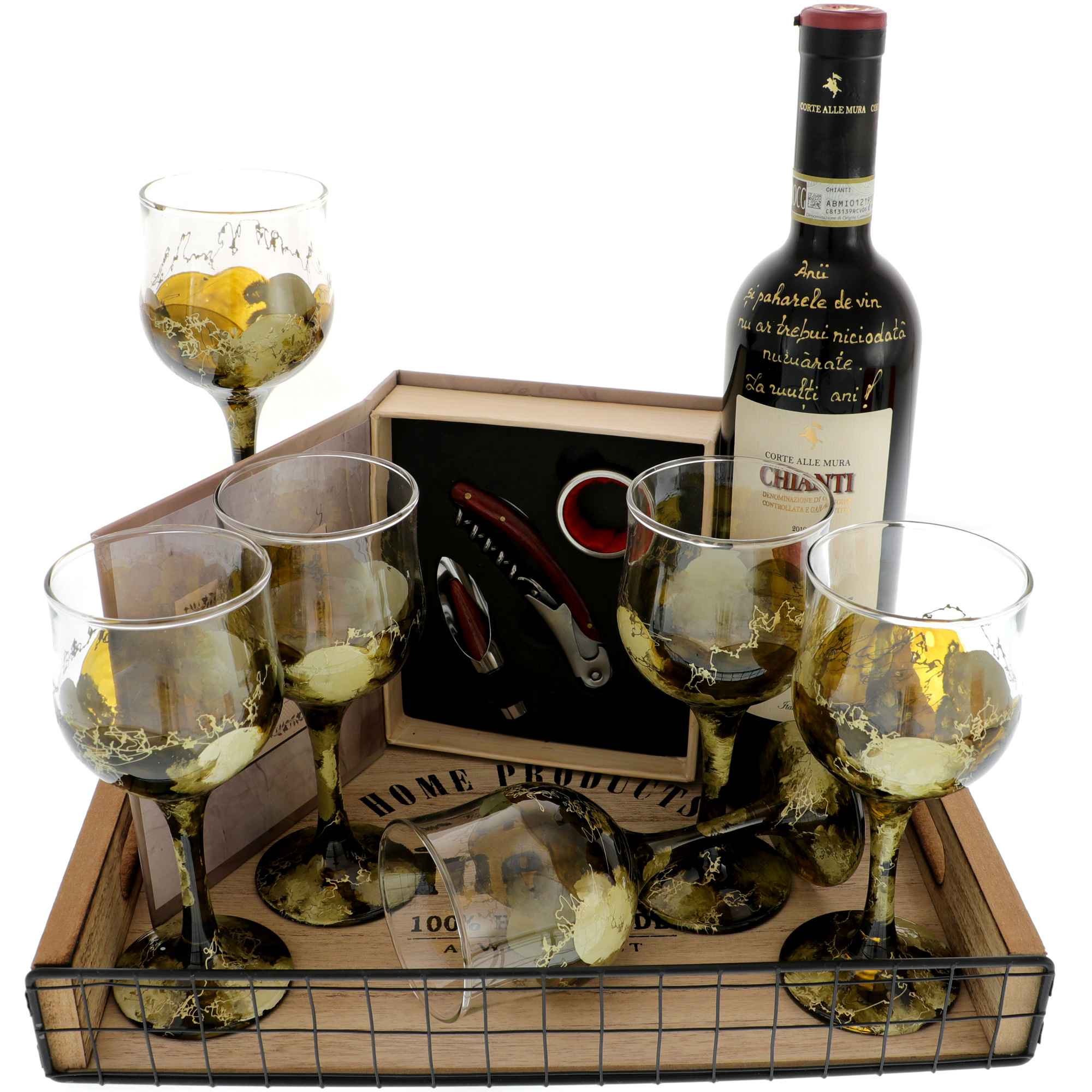 Set cadou barbati anii nu se numara, un cadou complet care contine un vin personalizat, 6 pahare pictate si accesorii de vin asezate pe o tava din lemn. Setul este un cadou ideal pentru o zi de nastere. Este alcatuit din: