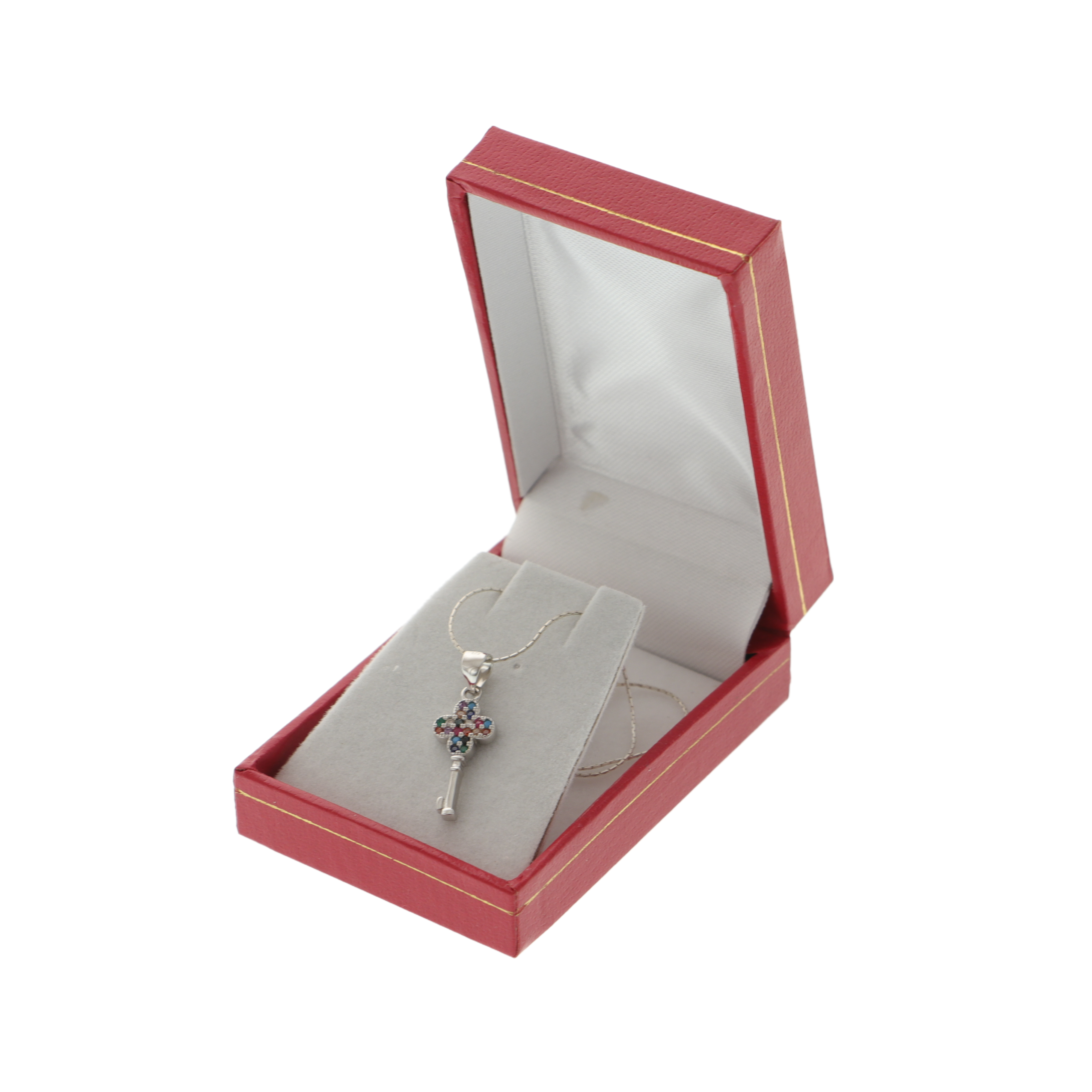 ✨ Lănțișor cu pandantiv din argint 925 în formă de cheie, decorat cu cristale multicolore, simbol al accesului la inimă și al sentimentelor autentice, prezentat într-o cutie elegantă de bijuterii;