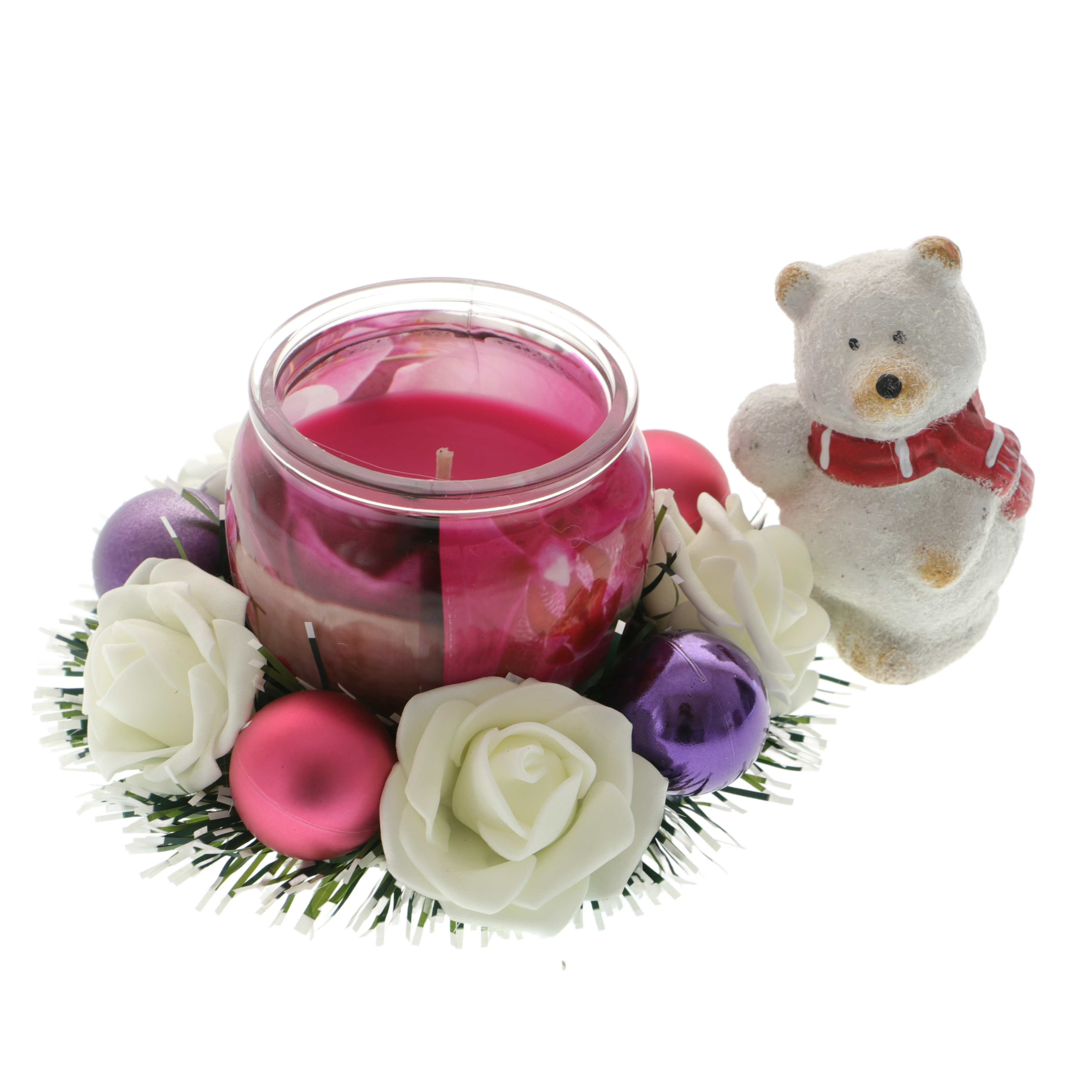 Decor festiv cu lumânare parfumată, globuri și flori – un mic colț de magie pentru casă.