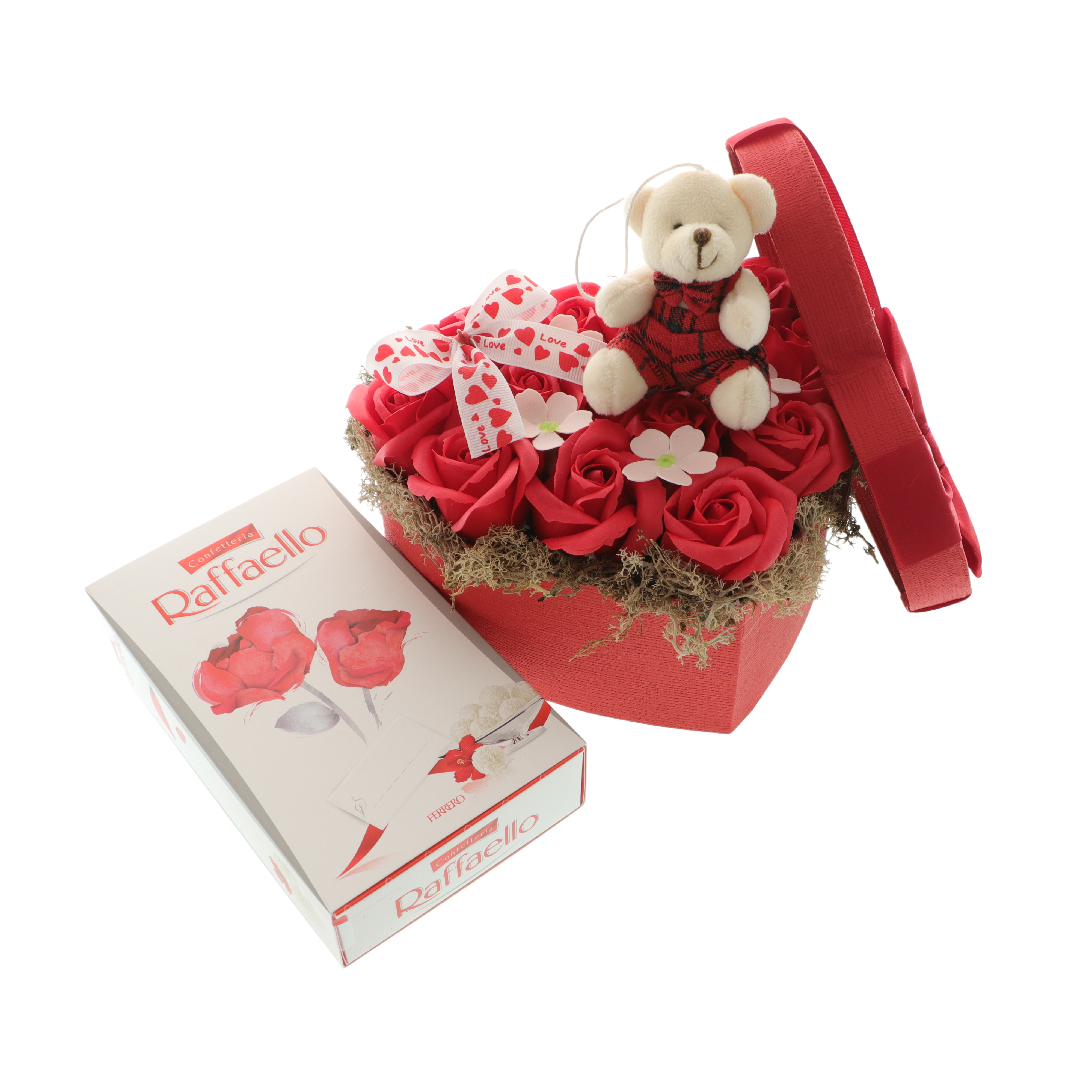 Setul este completat de un ursuleț simpatic de pluș, cu înălțimea de 8 cm, și o cutie de praline Raffaello, pentru un plus de rafinament și dulce surpriză.