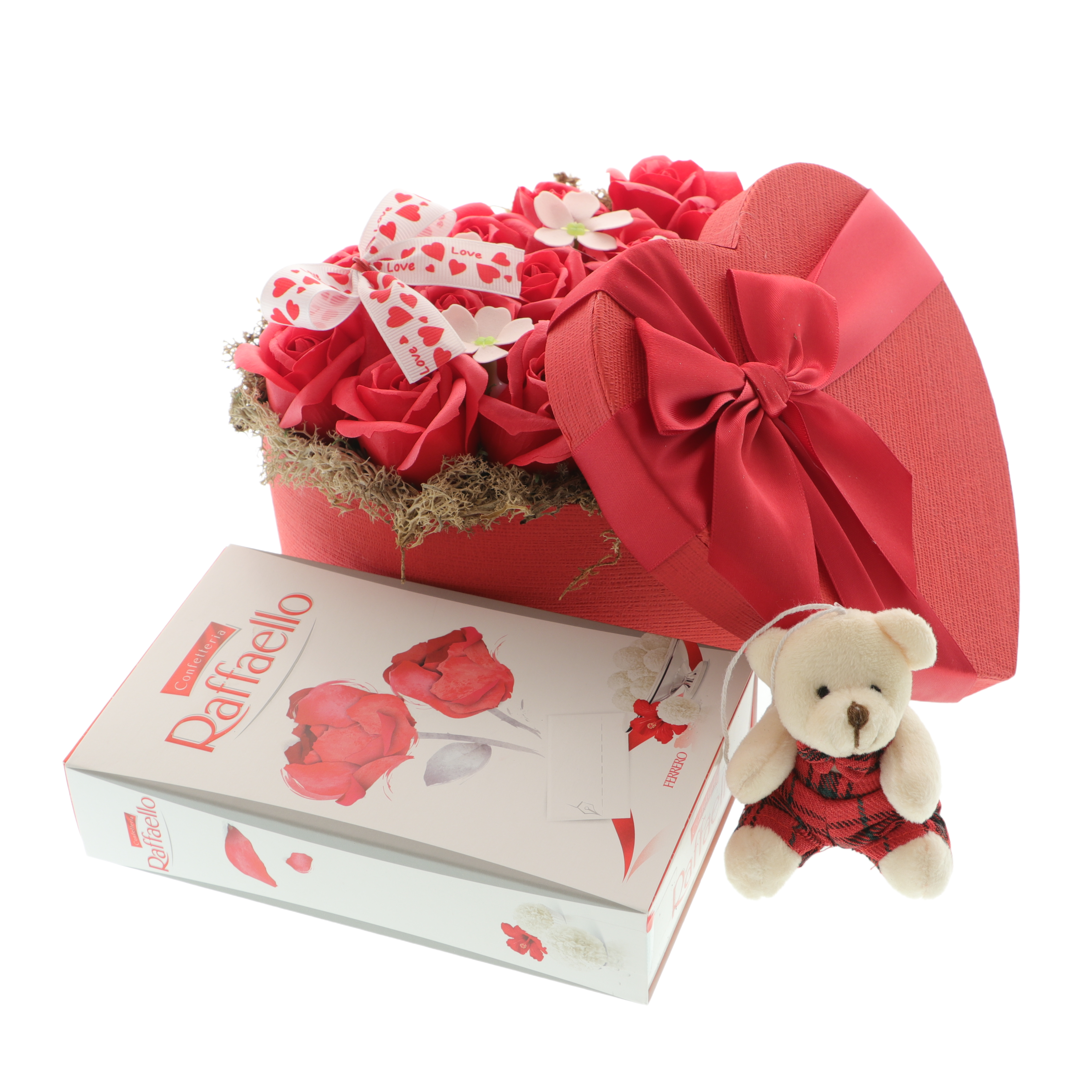 Setul cadou cu trandafiri, ursuleț și praline în cutie inimă este alegerea perfectă pentru a crea un moment emoționant și memorabil.