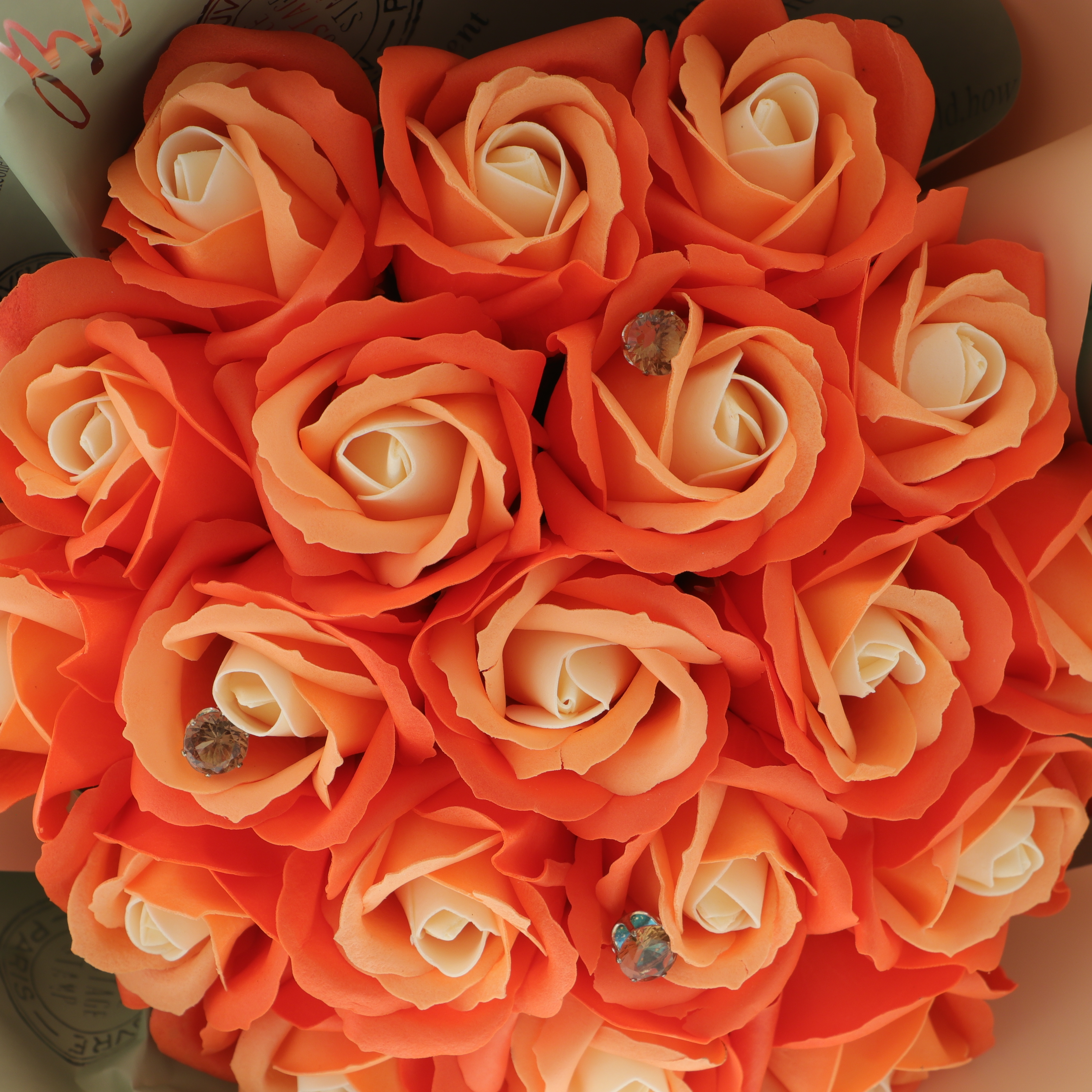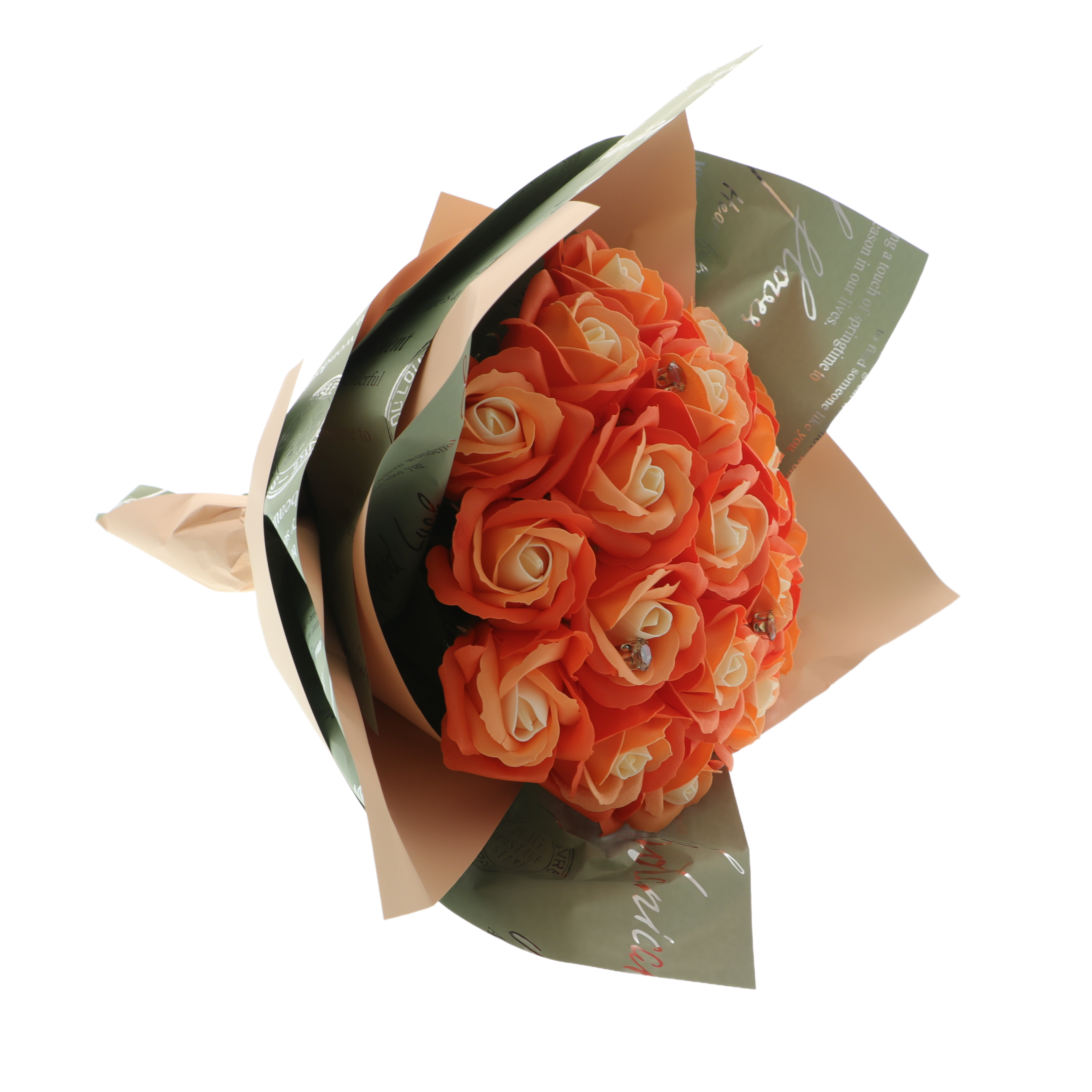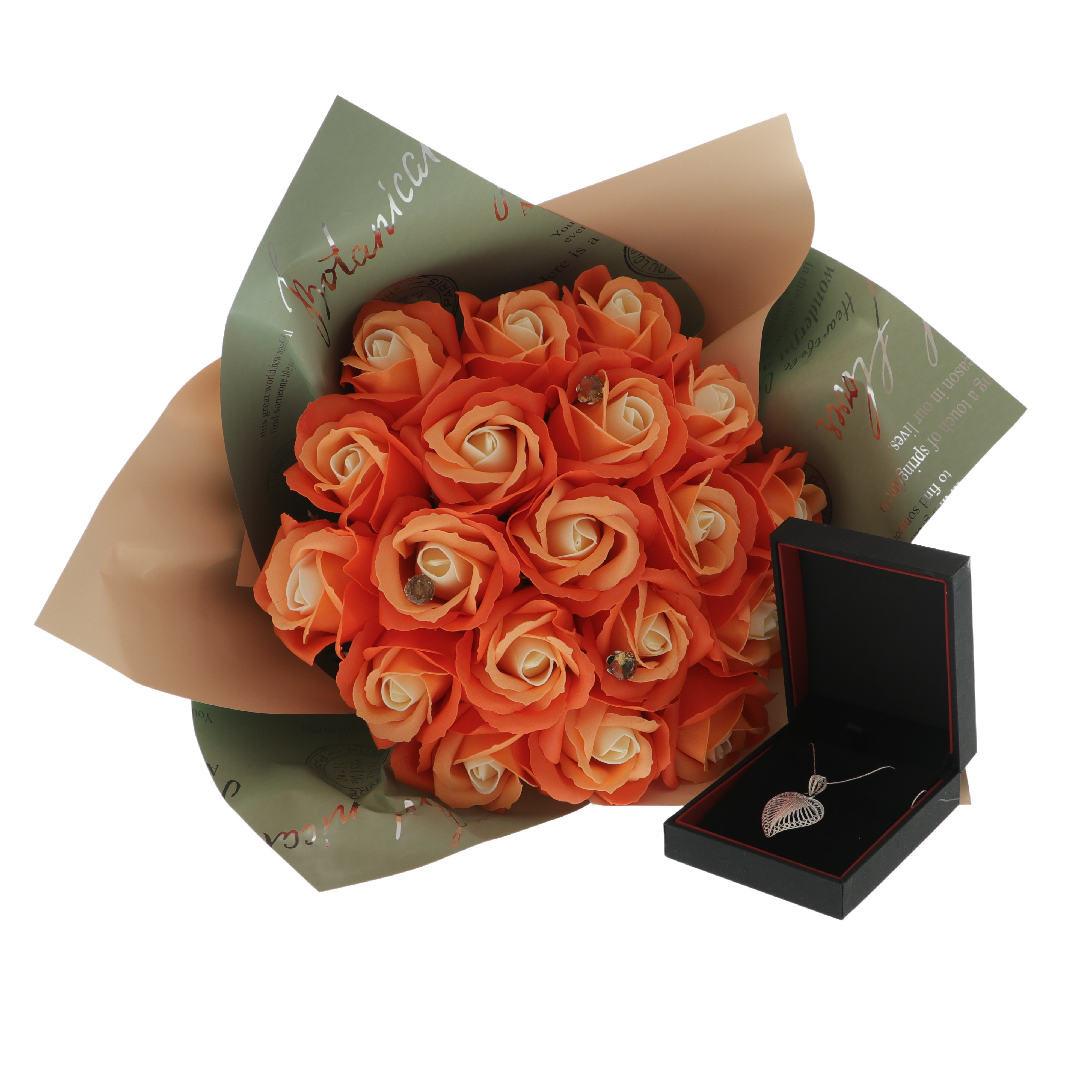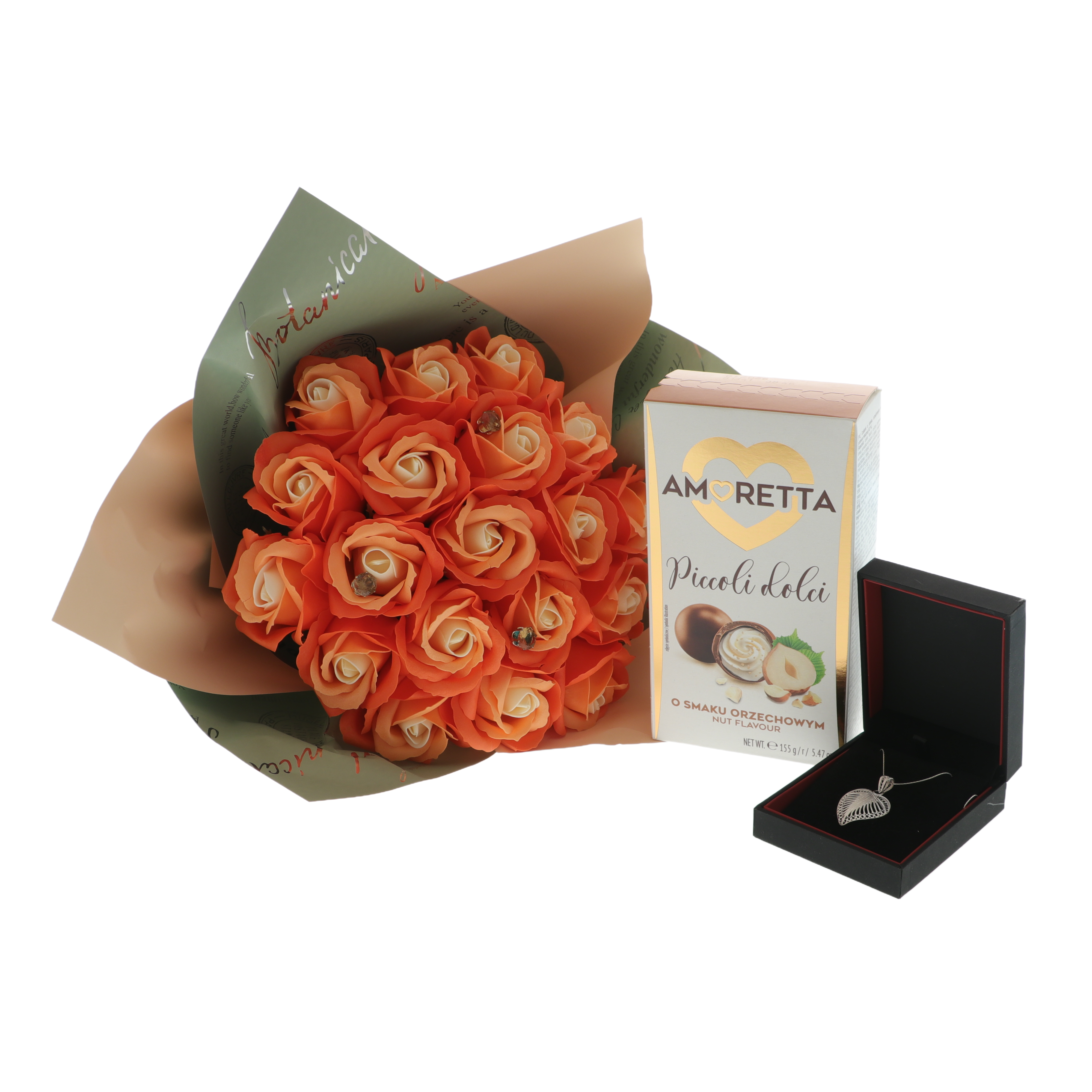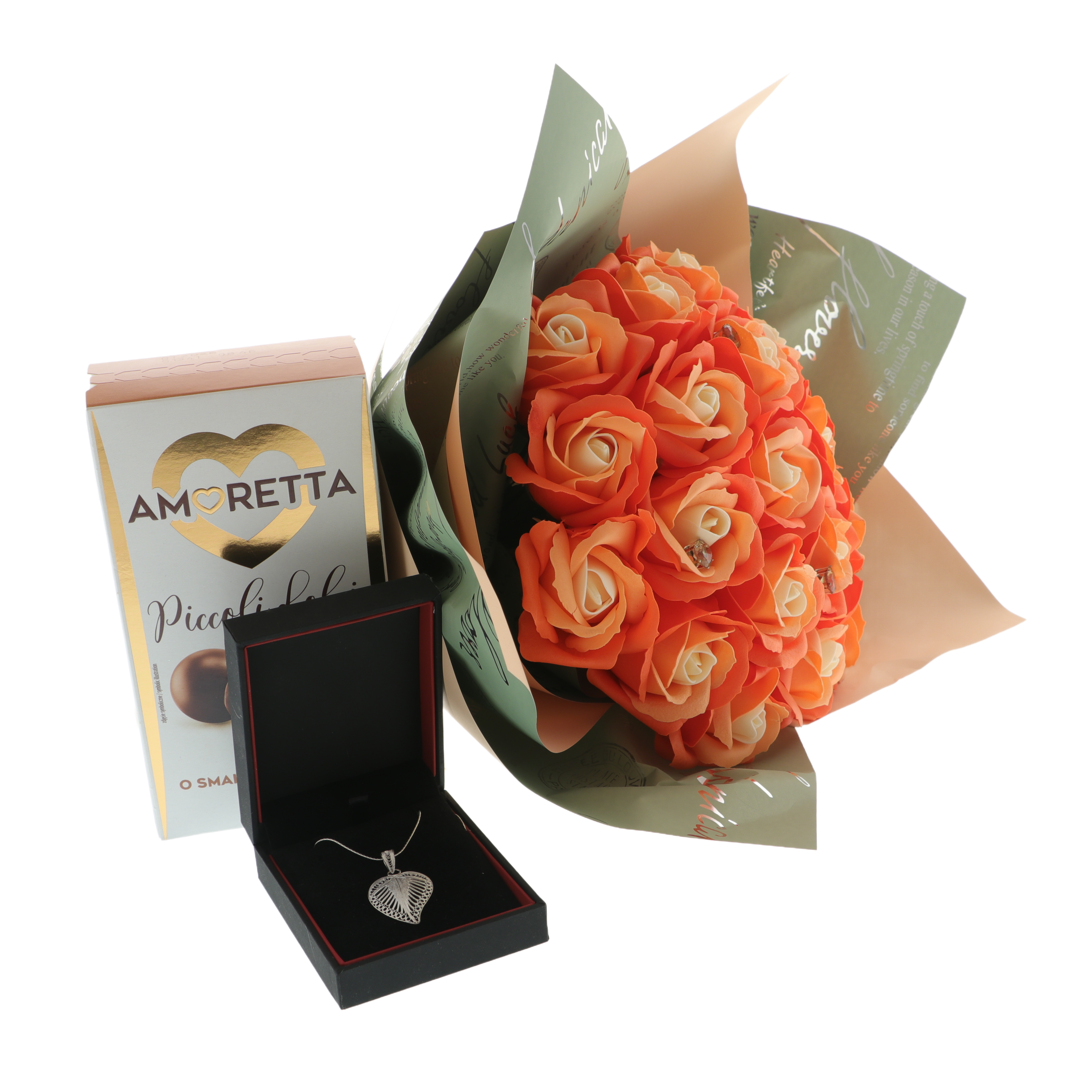 Setul conține un buchet format din 19 trandafiri portocalii realizați din săpun, care își păstrează aspectul impecabil în timp, un colier din argint 925 cu pandantiv în formă de inimă, cu diametrul de 2 cm, prezentat într-o cutie elegantă de bijuterii, și o cutie de praline de ciocolată cu cremă de alune, perfecte pentru momentele de răsfăț.