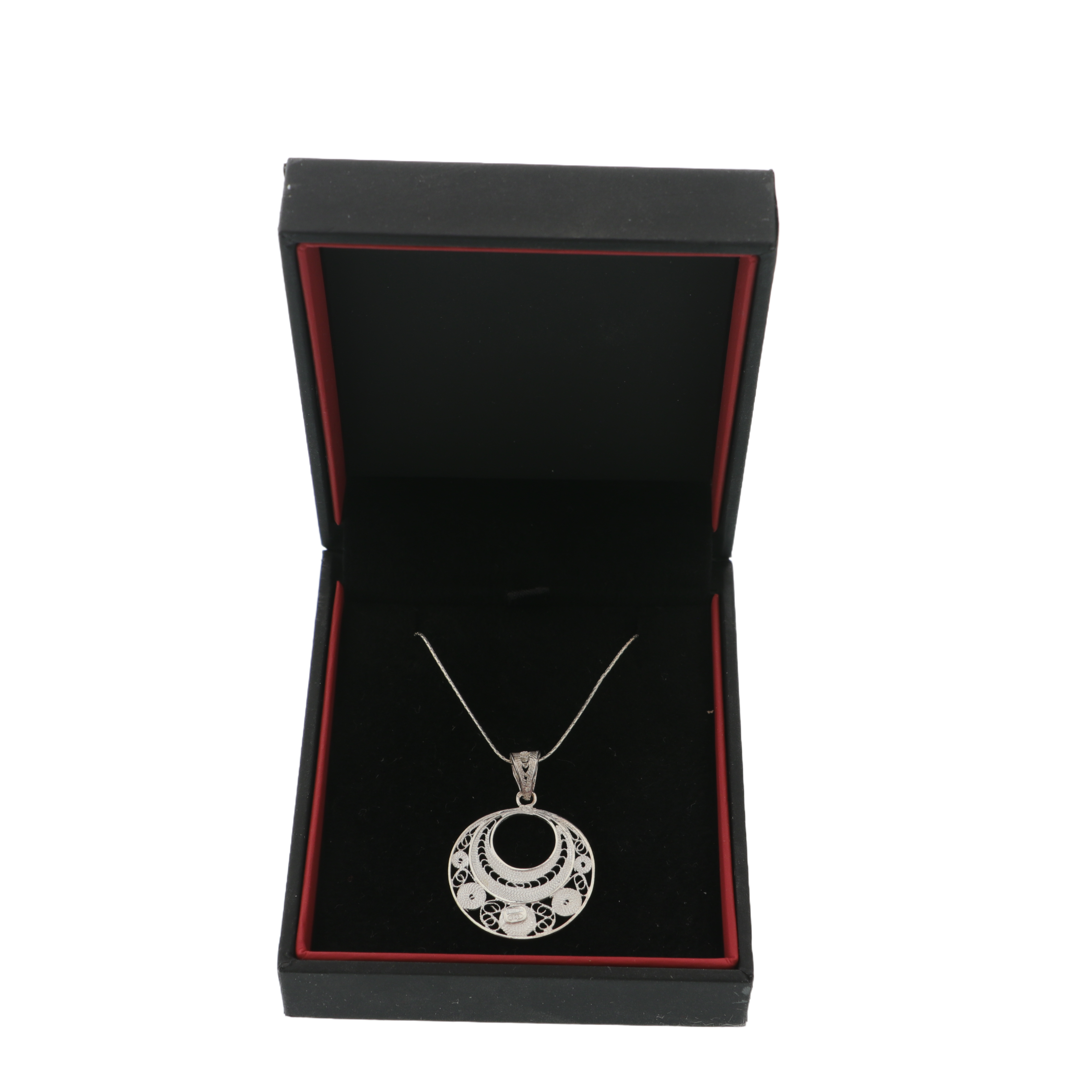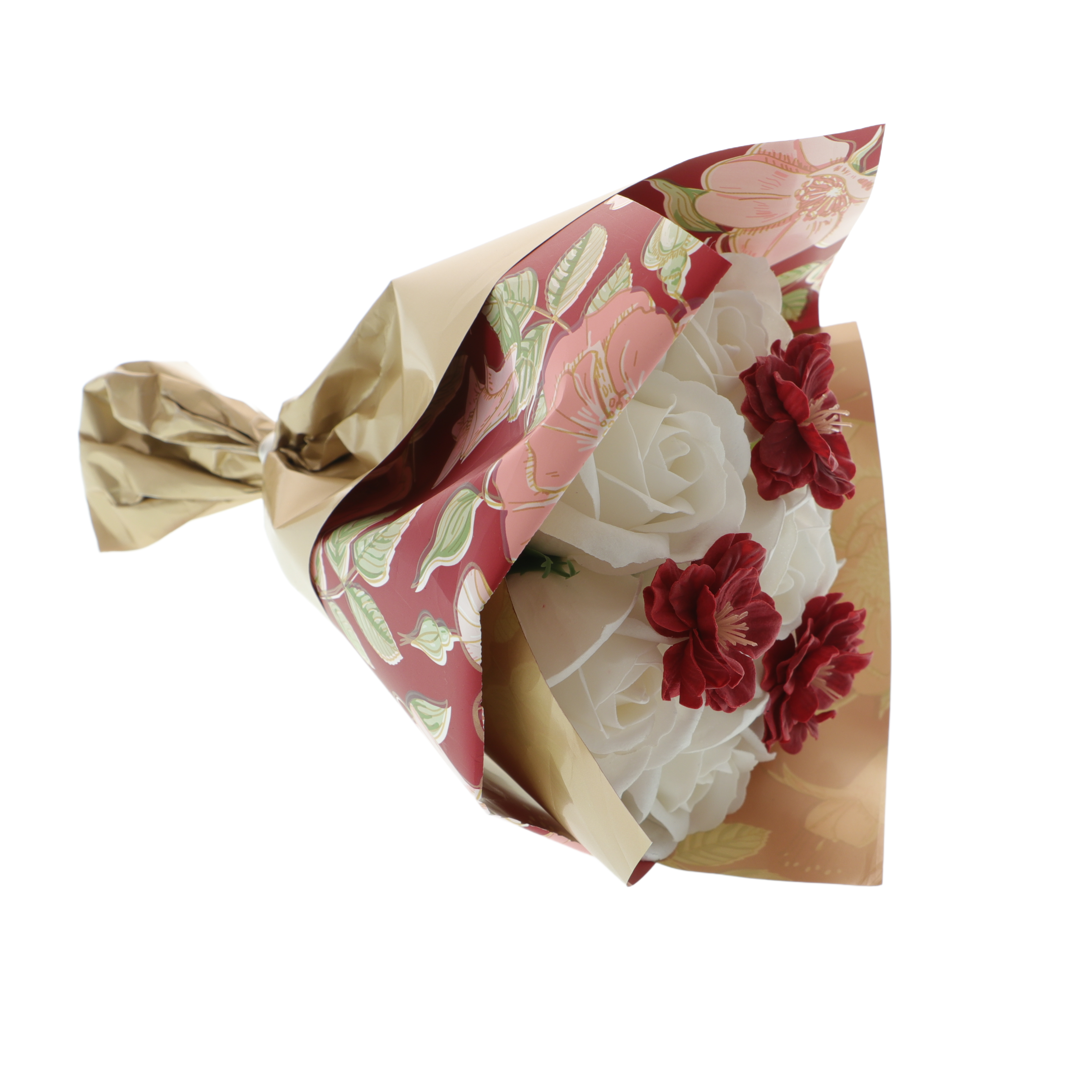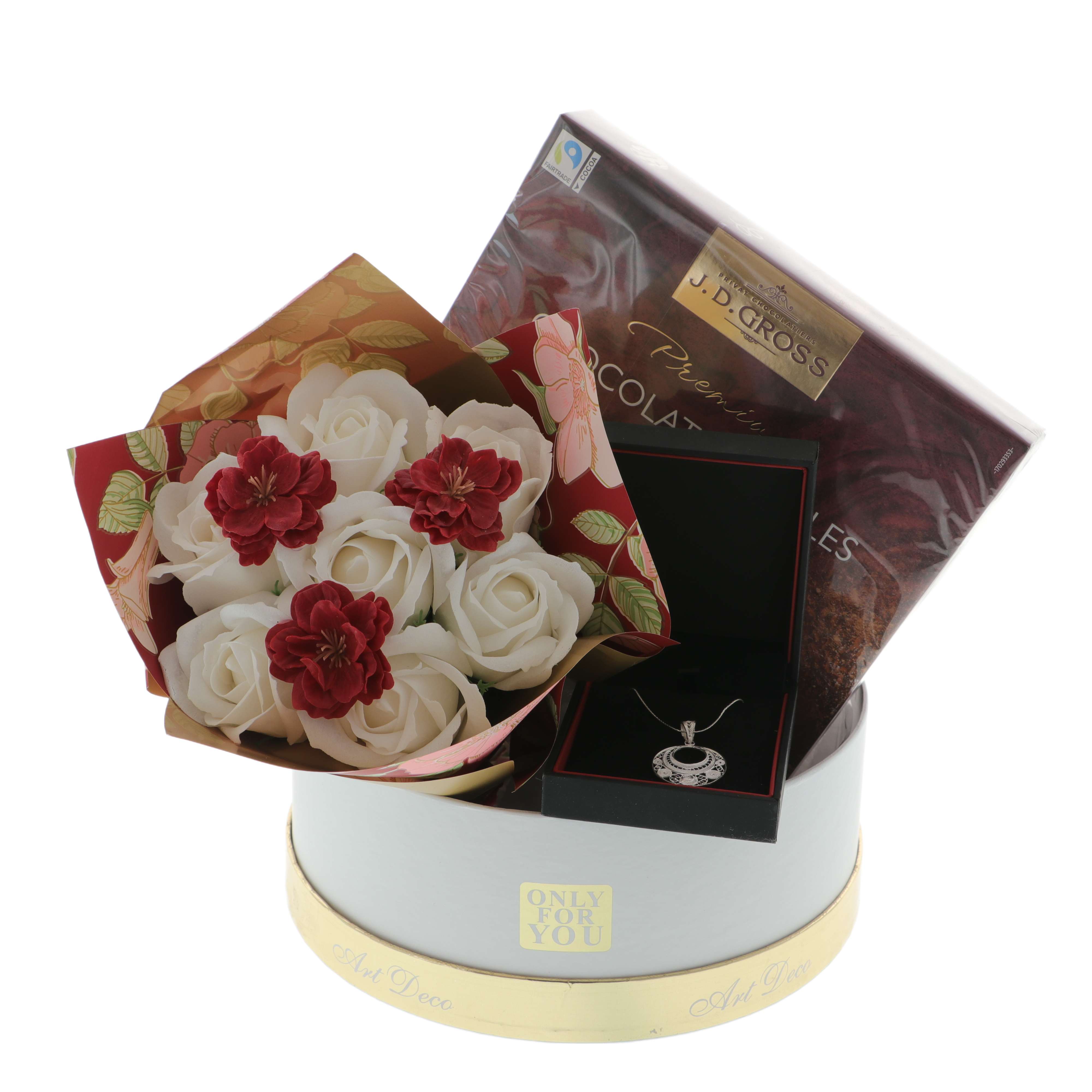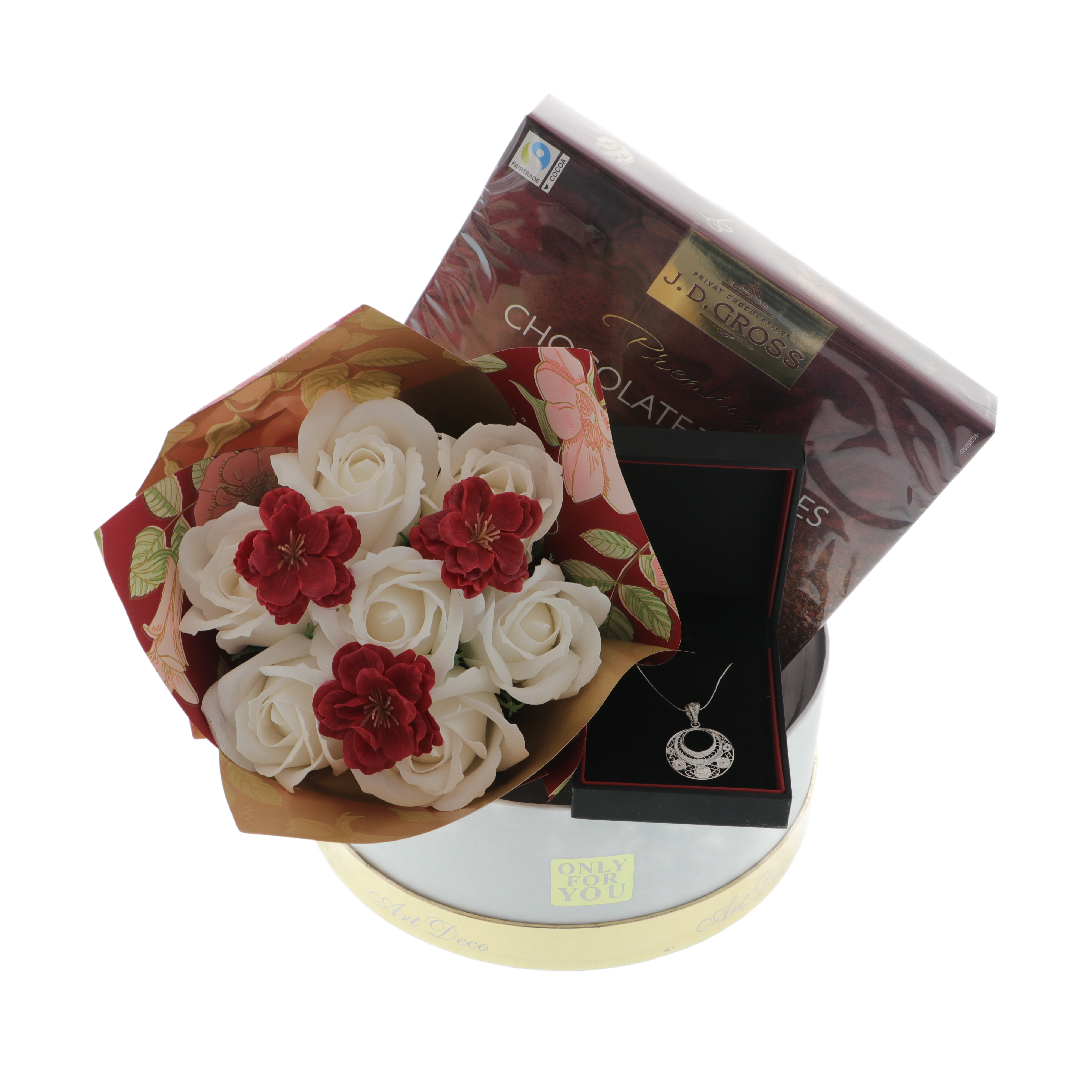 Setul conține o bijuterie din argint 925, formată dintr-un pandantiv rotund cu motive florale delicate, cu diametrul de 2,3 cm, completat de un lanț din argint, prezentat într-o cutie elegantă de bijuterii. Buchetul floral este realizat din 7 trandafiri albi și 3 flori de cireș vișinii din săpun, oferind un aspect romantic și durabil. În plus, setul include praline premium J.D. Gross Exquisite Chocolate Truffles (200 g), pentru un plus de răsfăț.