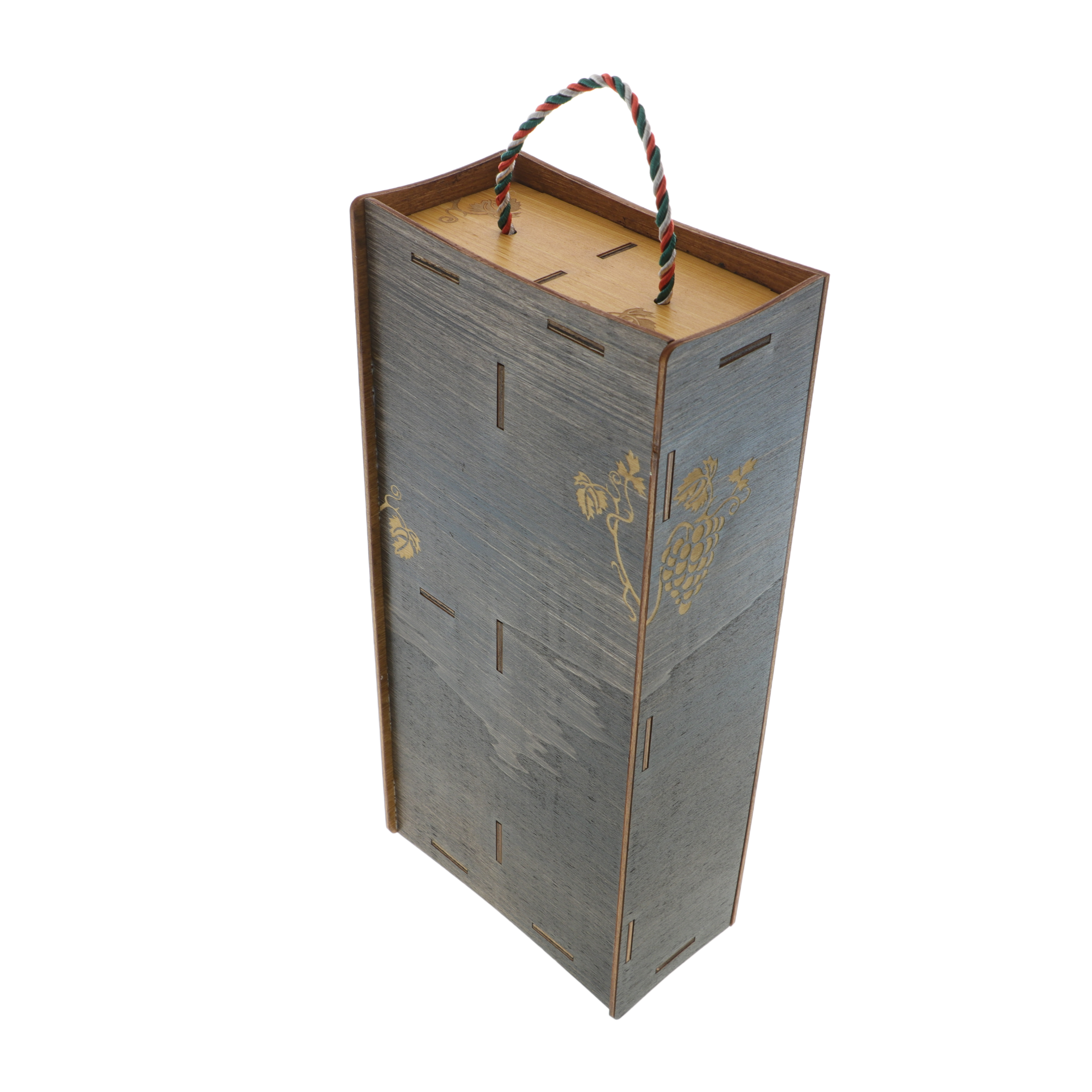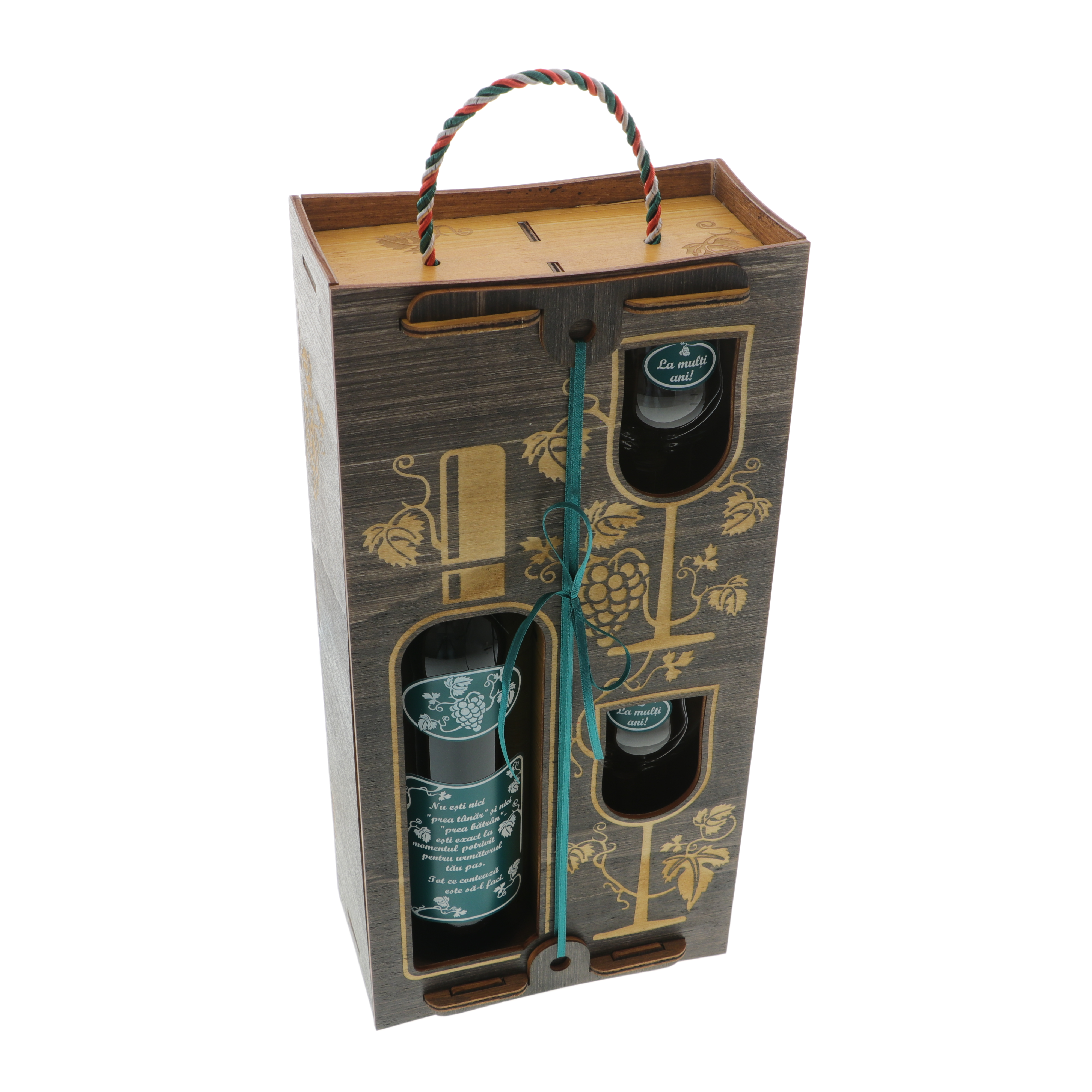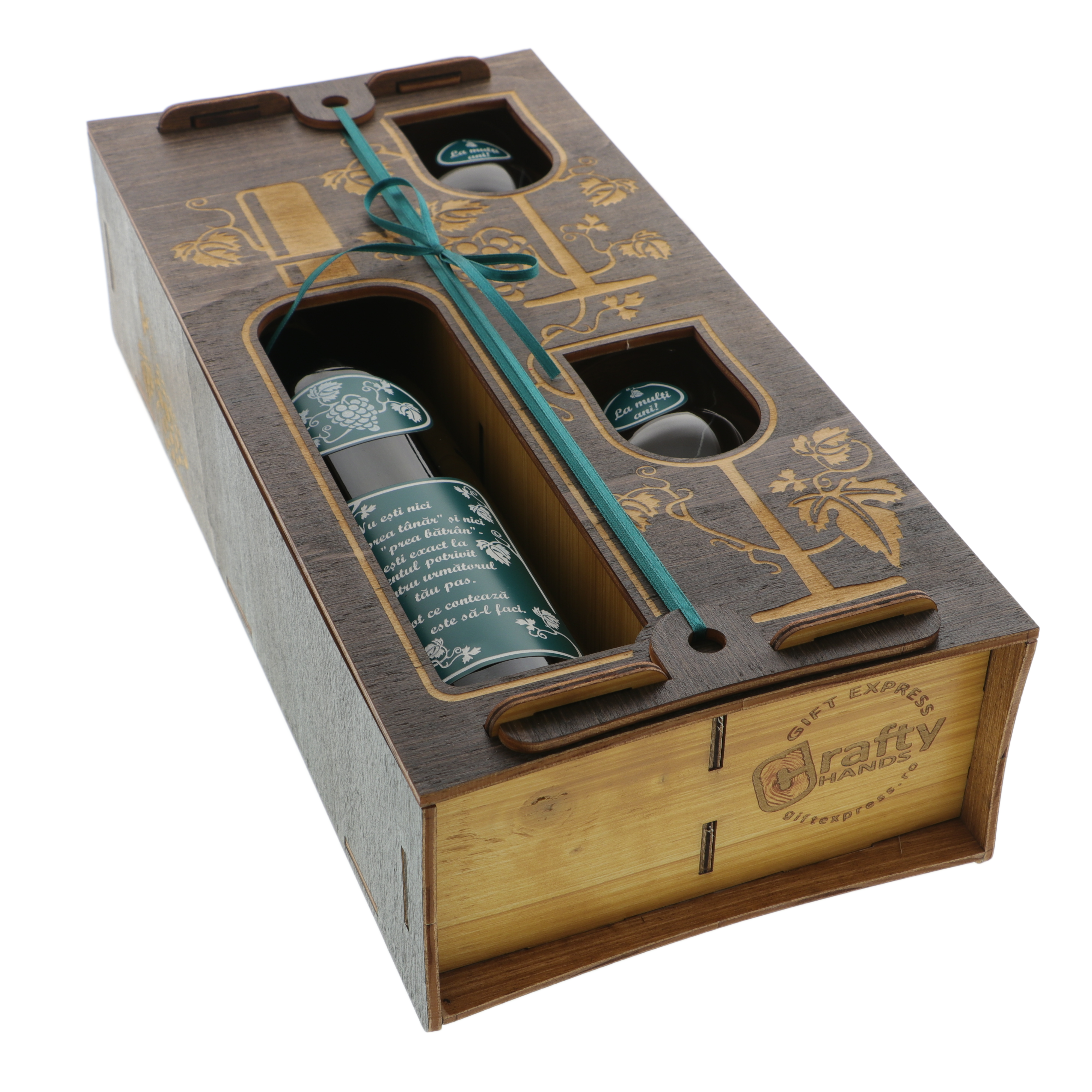 Cutie din lemn natural, realizată special pentru acest set, decorată cu motive elegante de viță de vie și struguri