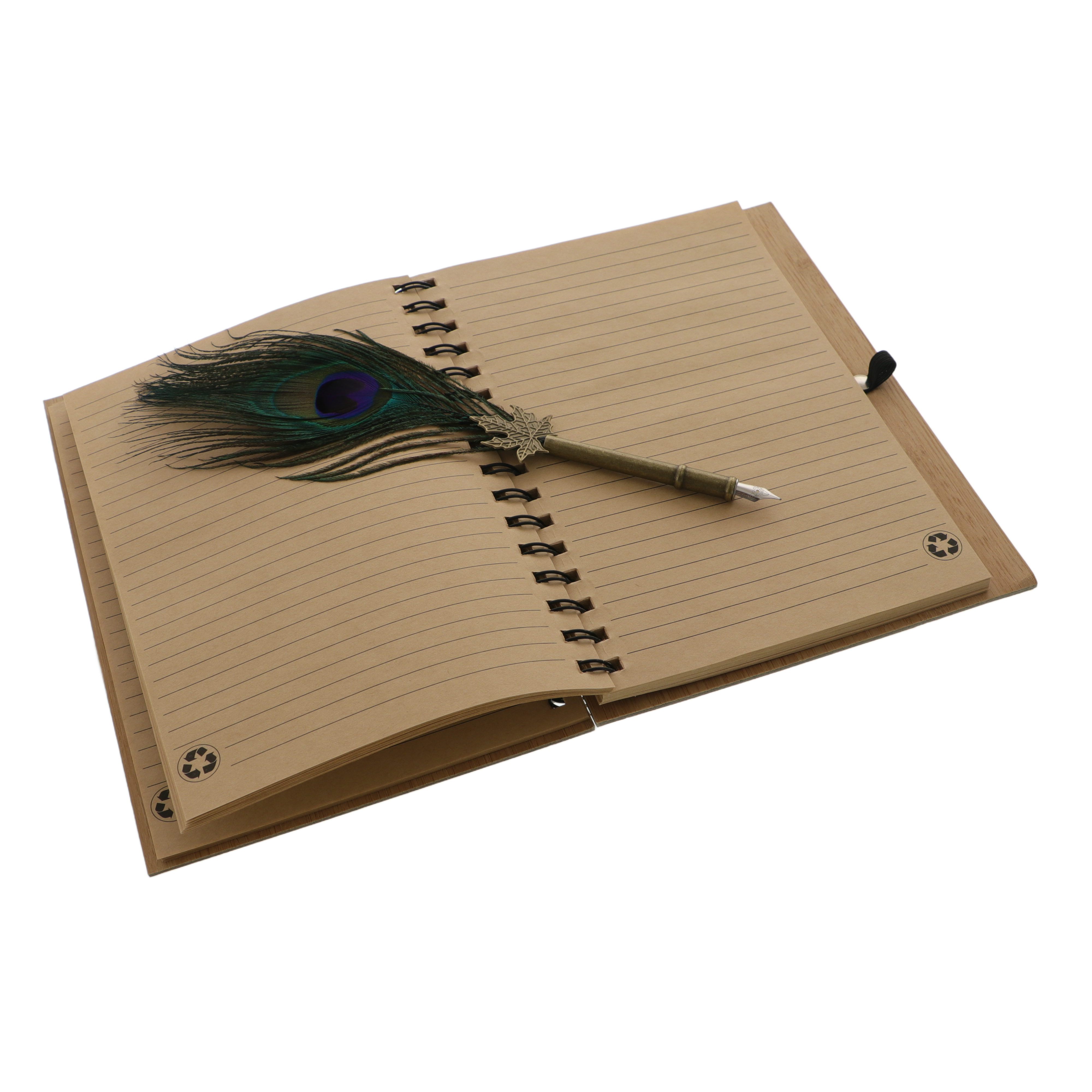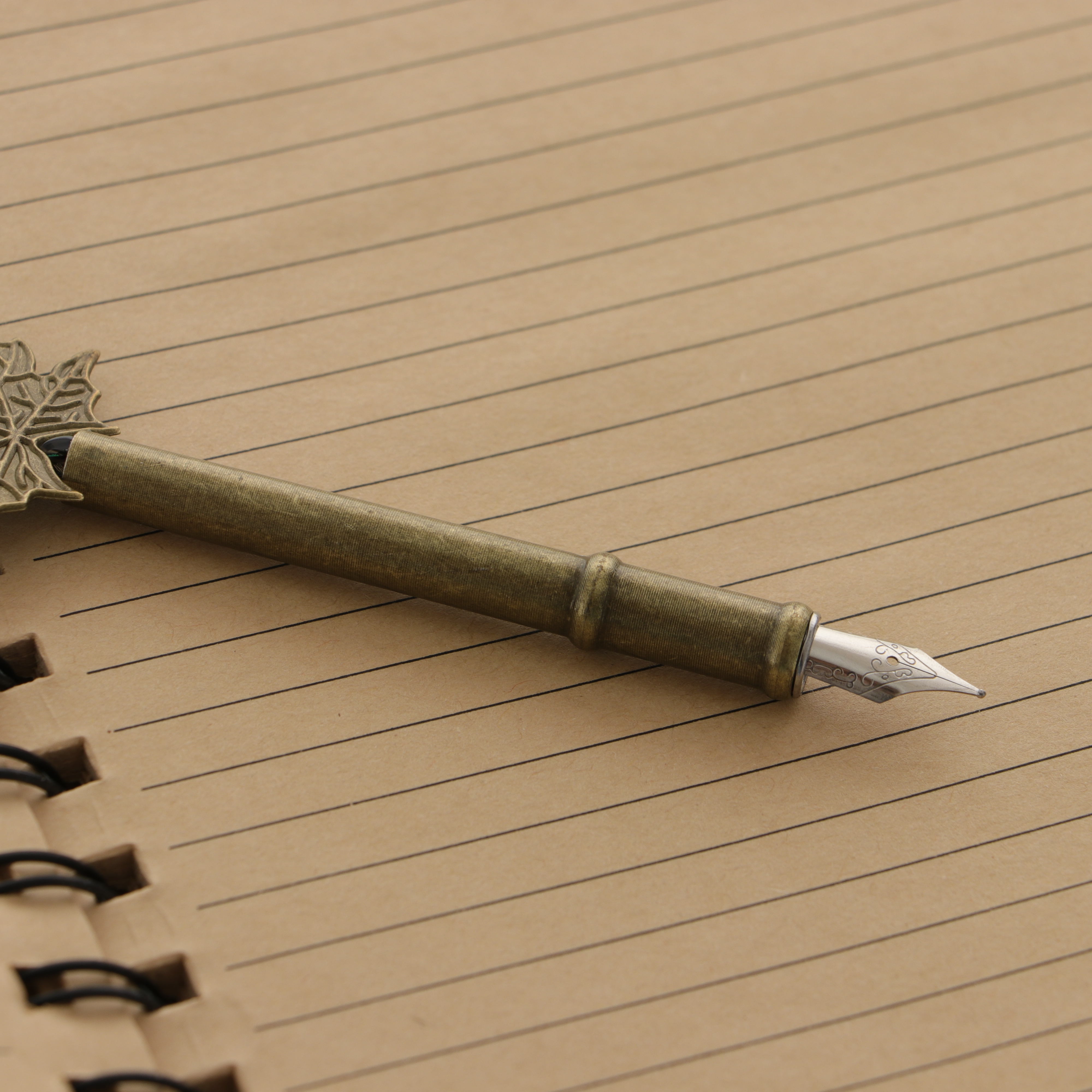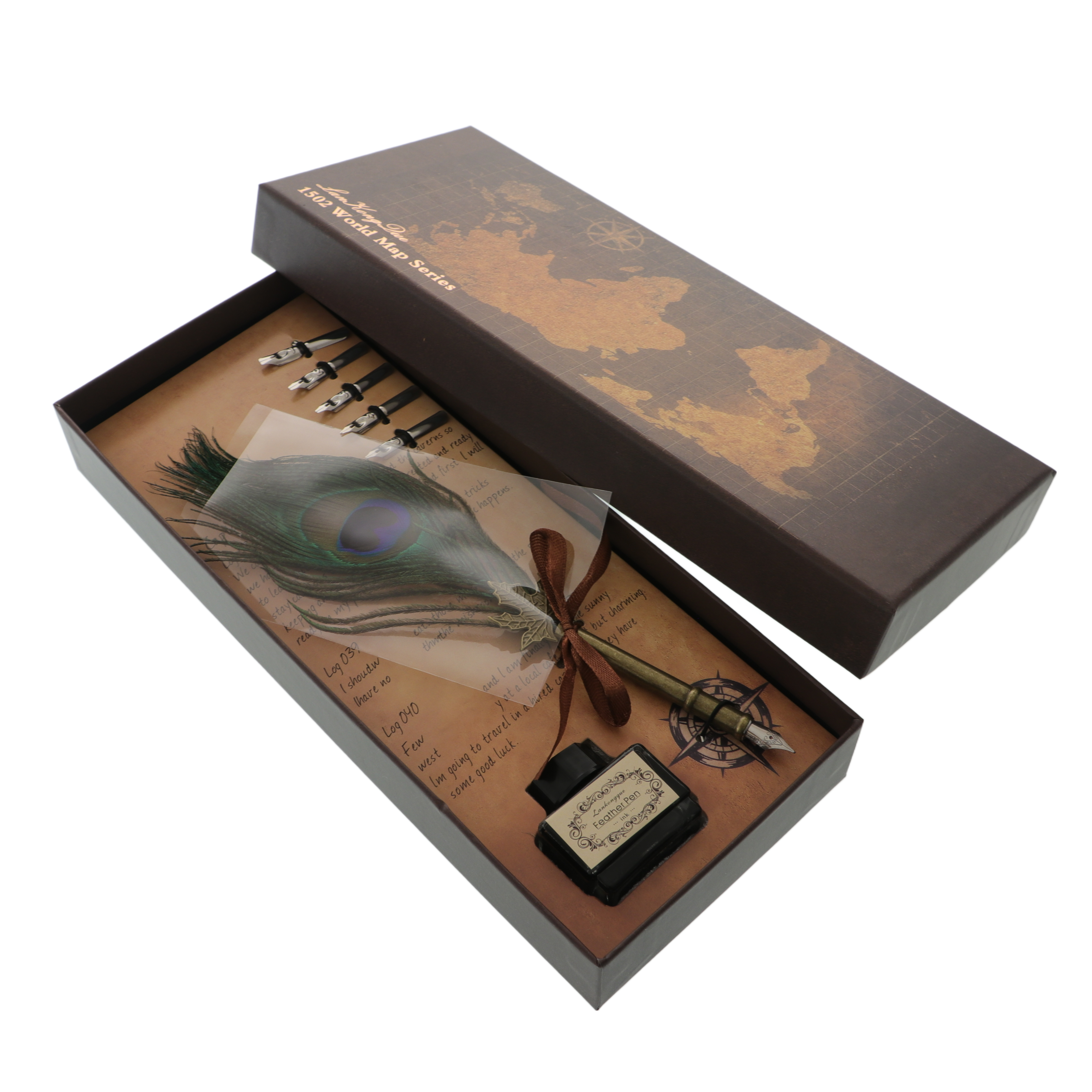 Set de caligrafie format din stilou cu pană de păun, calimară cu cerneală și 5 penițe metalice interschimbabile, cu vârfuri diferite
