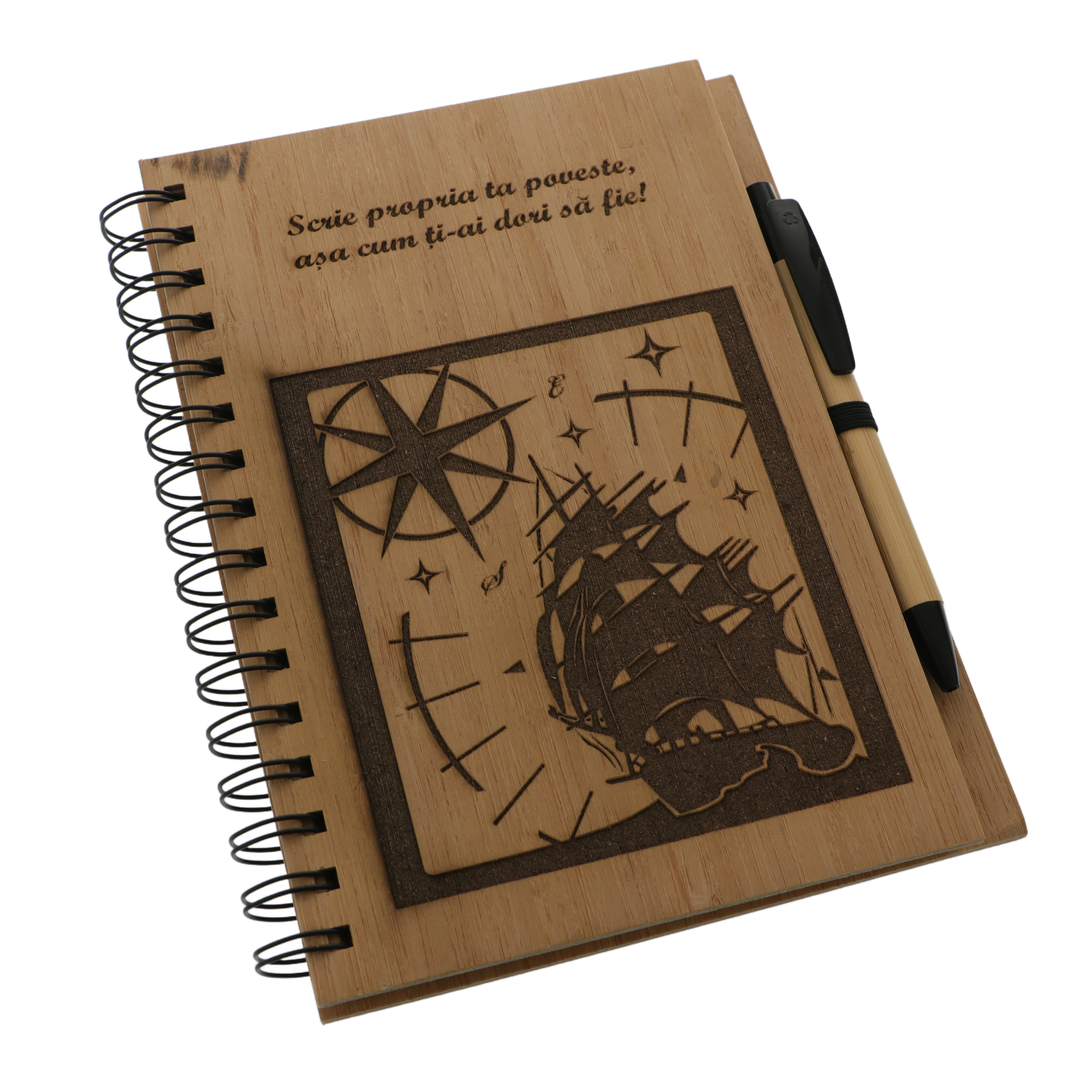 Agendă cu copertă din lemn de bambus, personalizată cu o corabie gravată și mesajul: