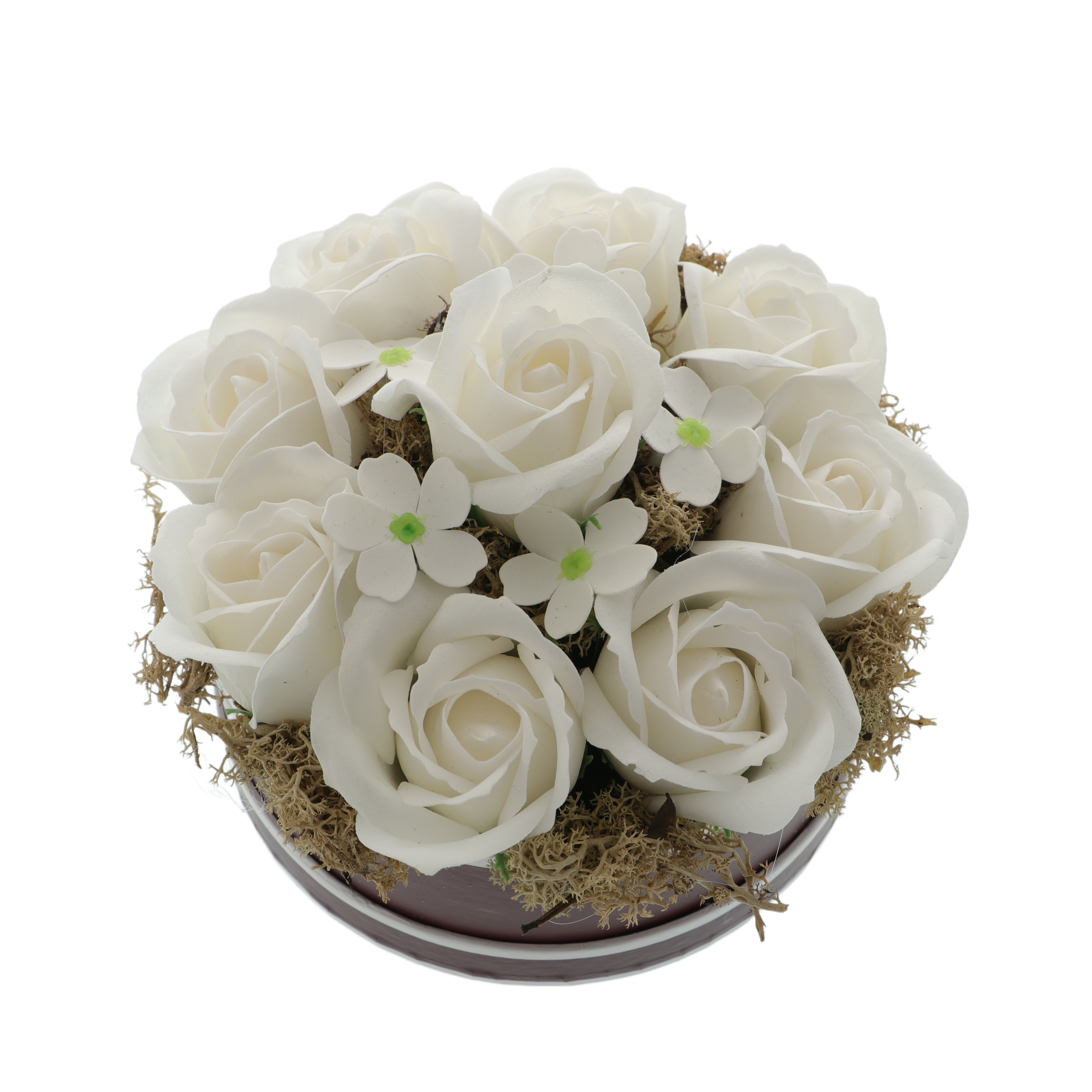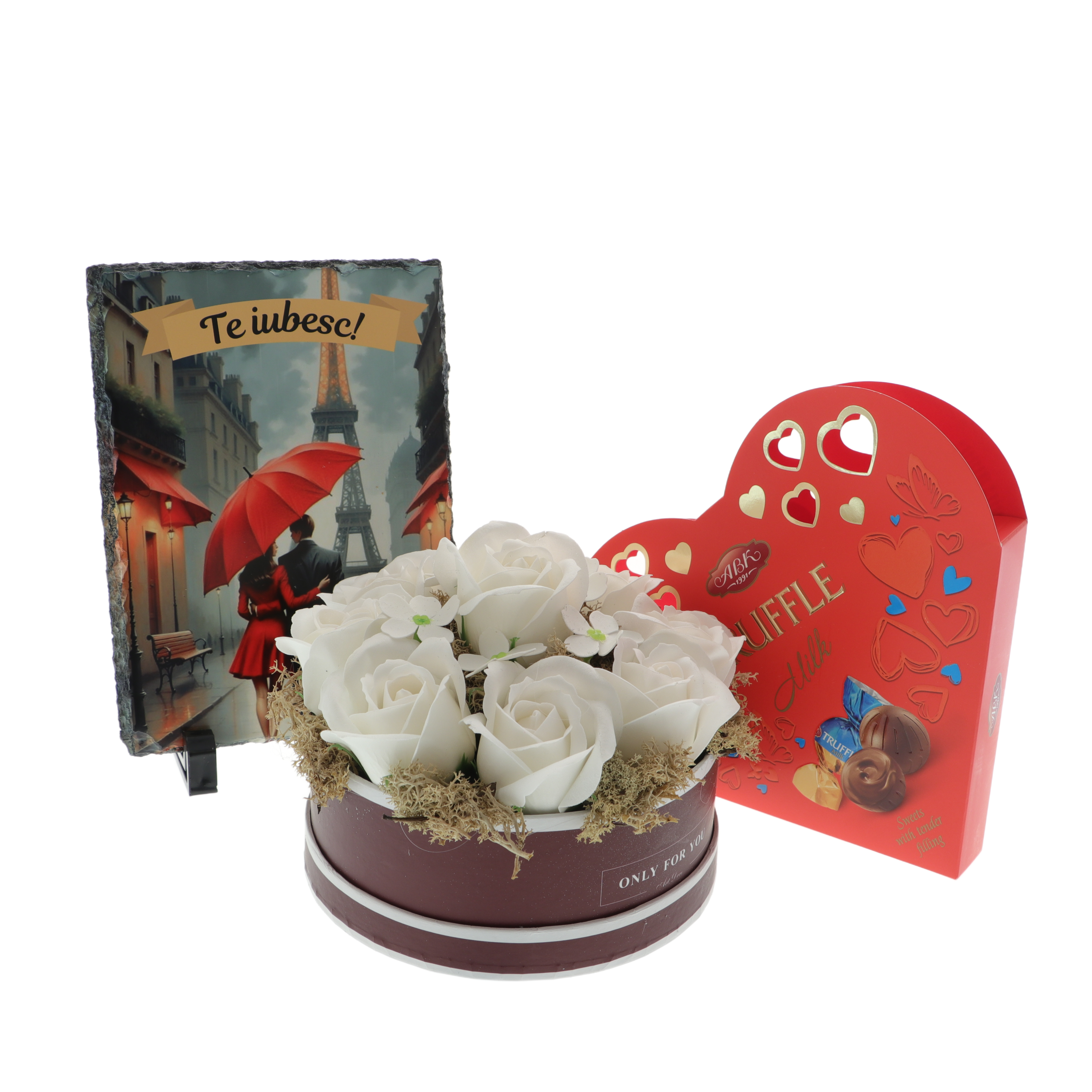 Complementar, setul include un aranjament floral elegant din trandafiri albi de săpun, care păstrează frumusețea și parfumul trandafirilor pentru mult timp, și o cutie de praline de ciocolată, pentru momente dulci împreună.