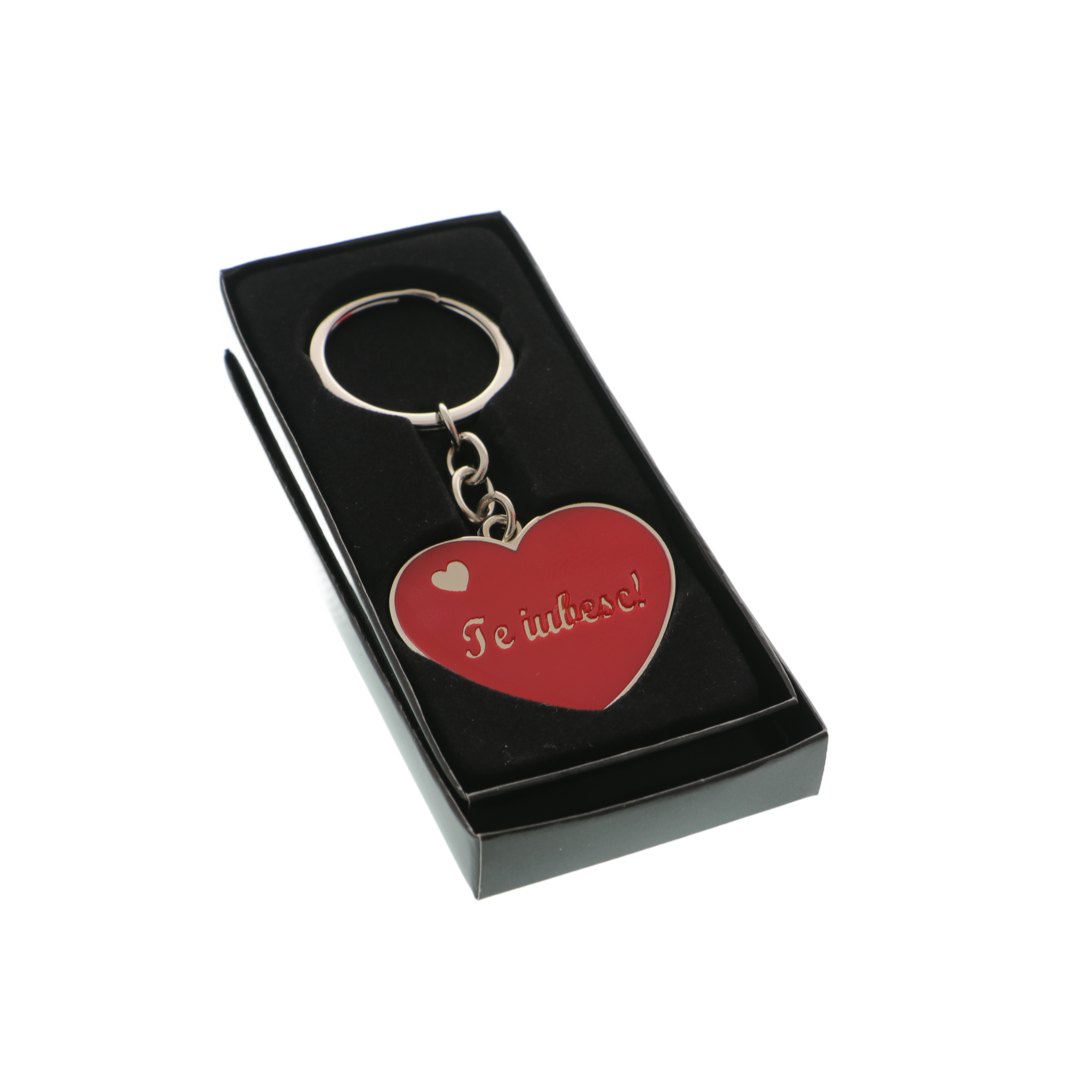 un breloc în formă de inimă roșie, inscripționat cu mesajul „Te iubesc” – mesajul poate fi personalizat la cerere