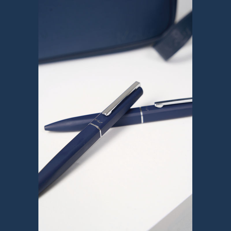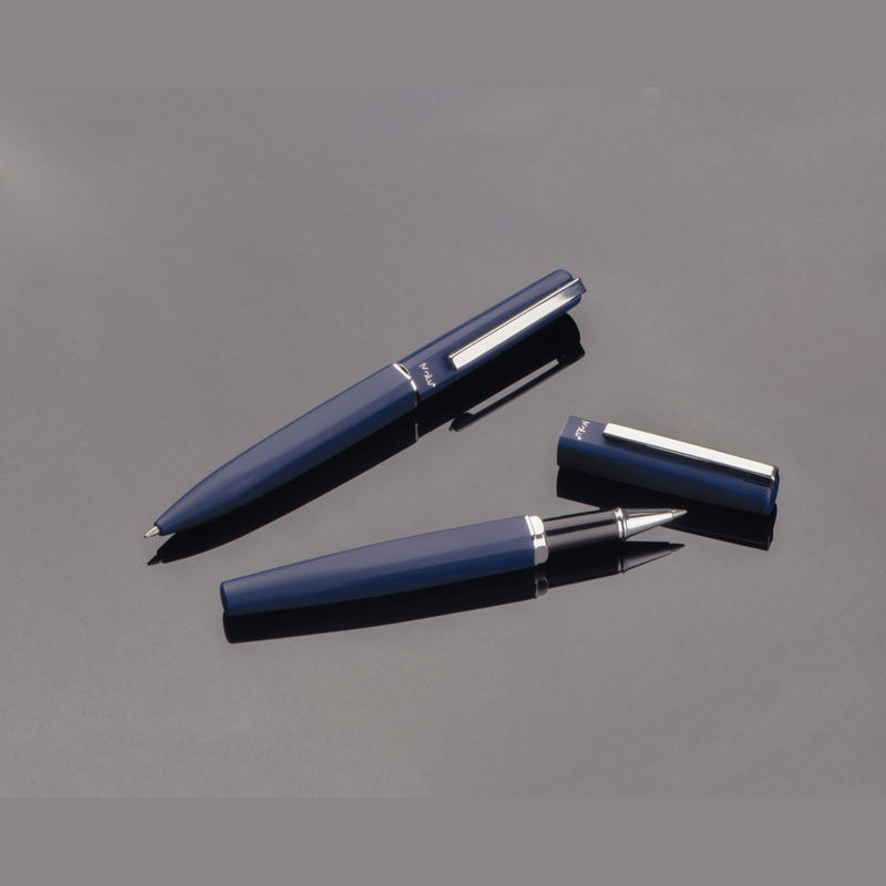 Descoperă eleganța și rafinamentul scrisului cu acest set premium care include un pix și un roller metalic de culoare albastru închis. Perfect pentru birou, școală sau cadou pentru cei dragi, setul combină designul sofisticat, funcționalitatea și posibilitatea de personalizare.