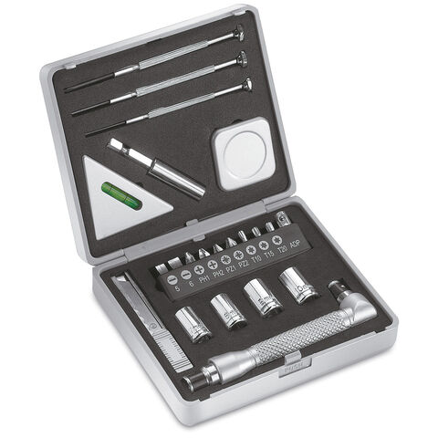 Set de unelte cu 22 piese, care contine şurubelniţe subtiri, cheie, ruletă, boloboc, cutter, cheie cu mai multe instrumente şi accesorii, toate din metal. Toate acestea sunt asezate în cutie de culoare argintiu mat din material plastic.