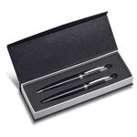 Un set elegant de ustensile de scris într-o cutie ideală pentru cadou. Setul conţine un stilou cucerneală albastră, pix cu cerneală neagră şi cartuş mic pentru stilou, ustensilele sunt din material plastic şi oţel inoxidabil.