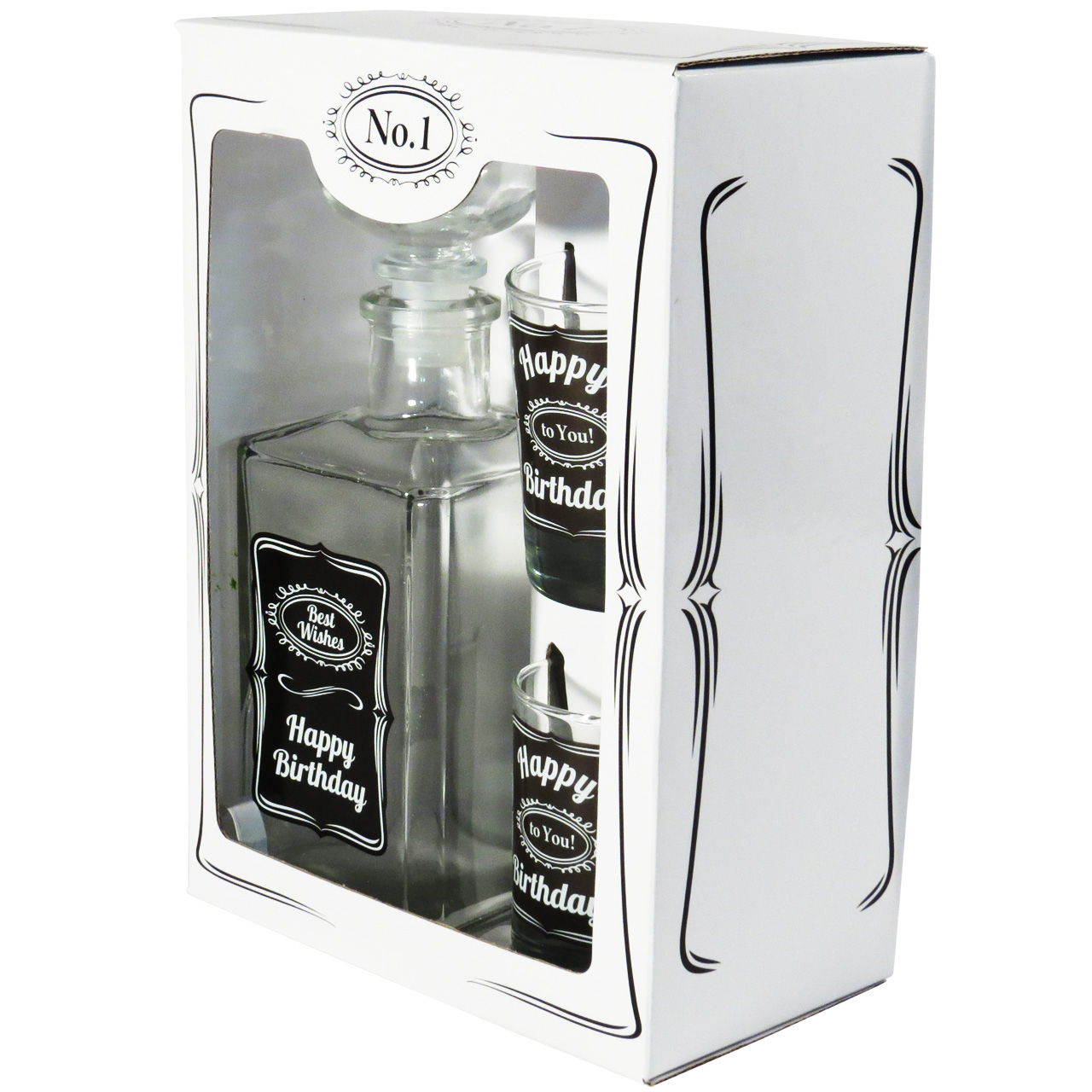 Un cadou special pentru consumatorii de tărie, format dintr-o sticlă specială de whisky şi 2 pahare. Toate piesele acestui set sunt din sticlă şi sunt inscripţionate cu Happy Birthday. Acest cadou este unul potrivit pentru o zi de naştere, indiferent de vârsta care urmează să fie împlinită de sărbătorit. Produsele sunt aşezate într-o cutie specială de cadouri.