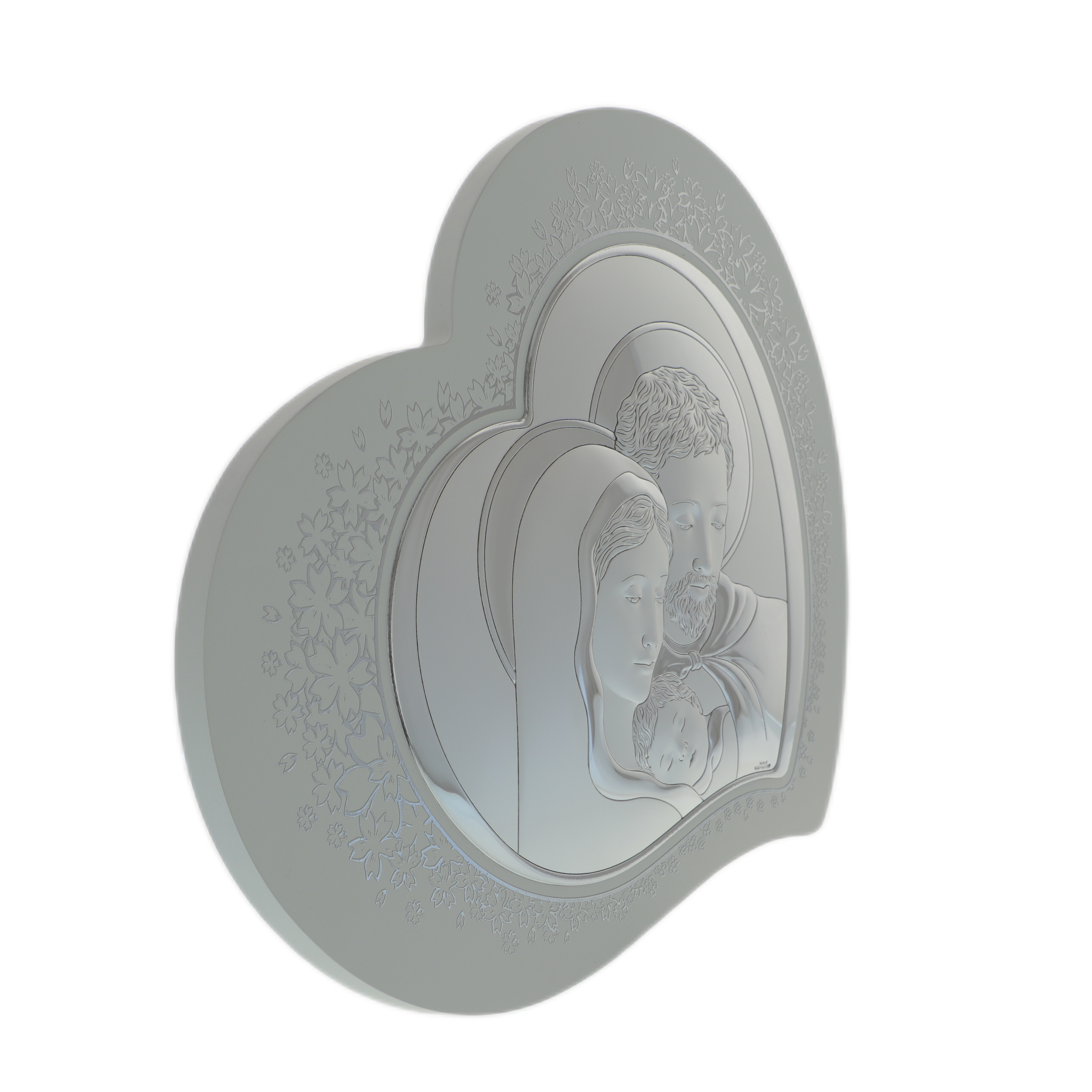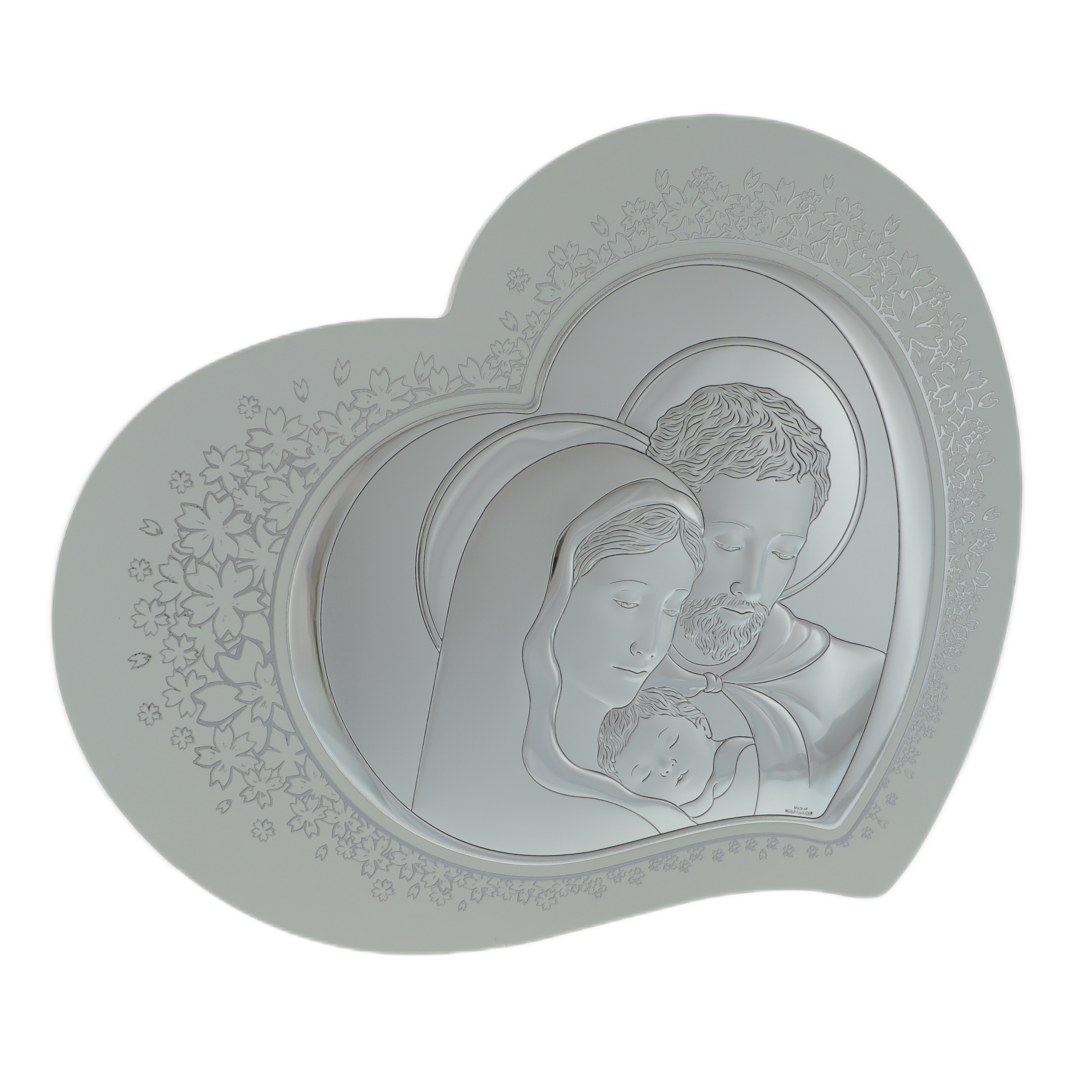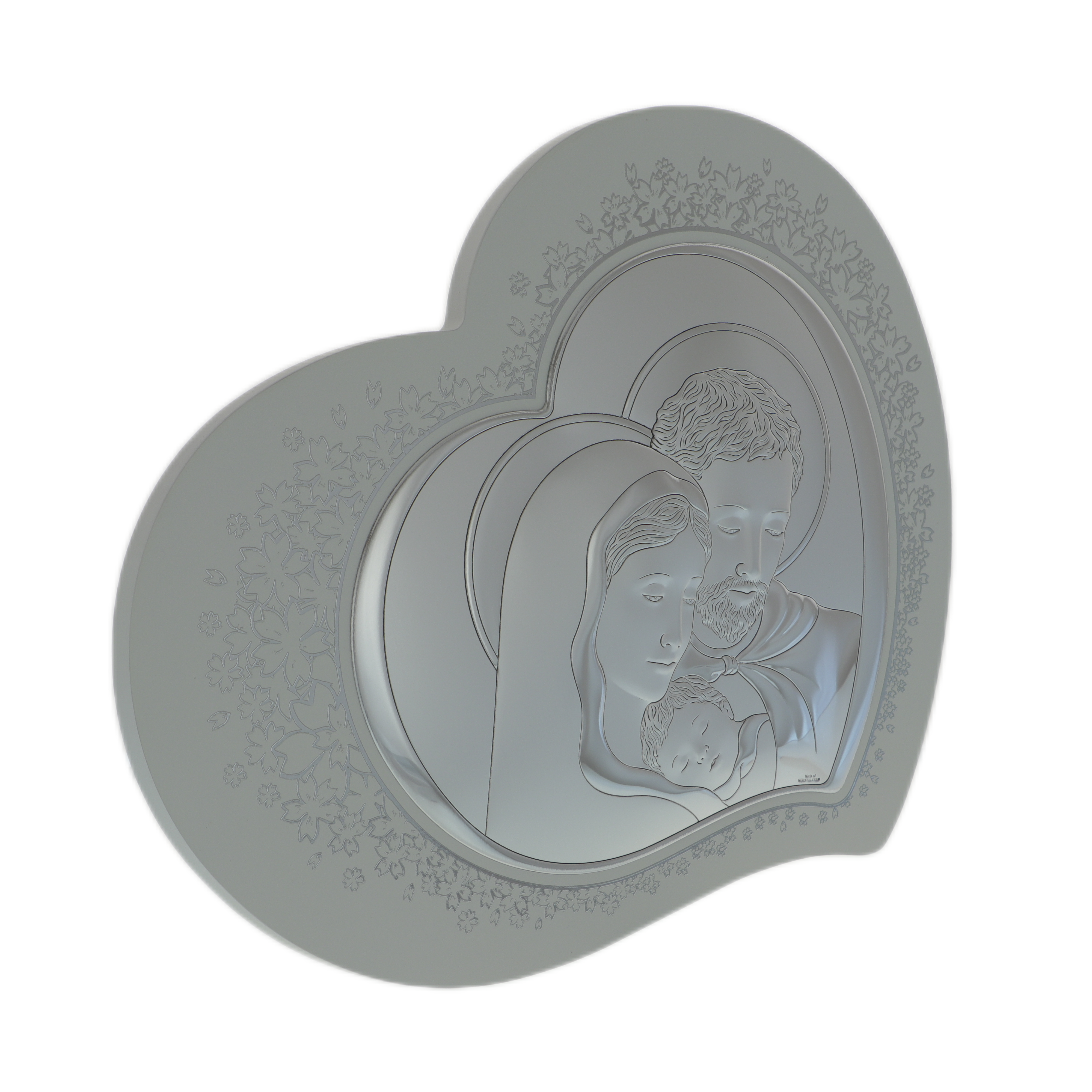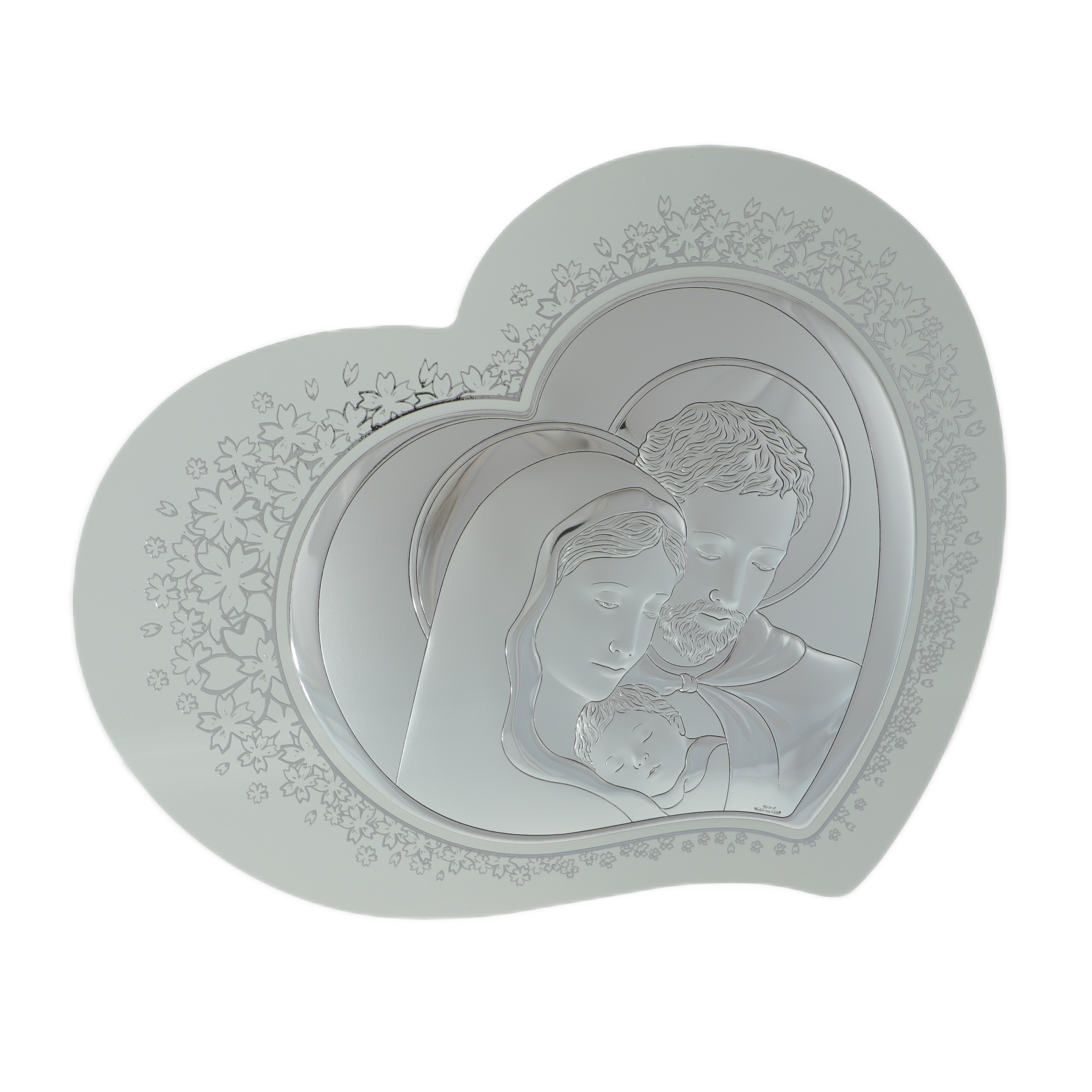 Icoana Sfânta Familie cu argint în formă de inimă este o creație deosebită, prelucrată manual cu grijă și măiestrie în Italia. Realizată din lemn și placată cu argint, această icoană elegantă și delicată emană o aură de sacralitate și frumusețe.