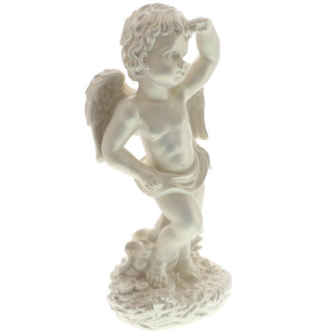 Statueta realizata in intregime din ceramica, in forma unui inger stand in picioare, cu o mana la sold si cealalta ridicata la frunte. Inaltime: 41 cm, finisaj perlat.