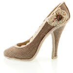 Suport bijuterii in forma de pantof cu toc. Este ideal pentru a va pastra in ordine cerceii cu surub si inelele. Produsul are 8 randuri a cate 3 cm fiecare. Este imbracat intr-un material textil, cu impletitura pe margine si decorat cu o floare si un nasture. Este un produs destinat doamnelor si domnisoarelor si poate fi folosit ca un simplu obiect decorativ. Pretul este valabil pentru un singur produs. Dimensiuni: 12.cm h, 12cm L, 4.5cm l.