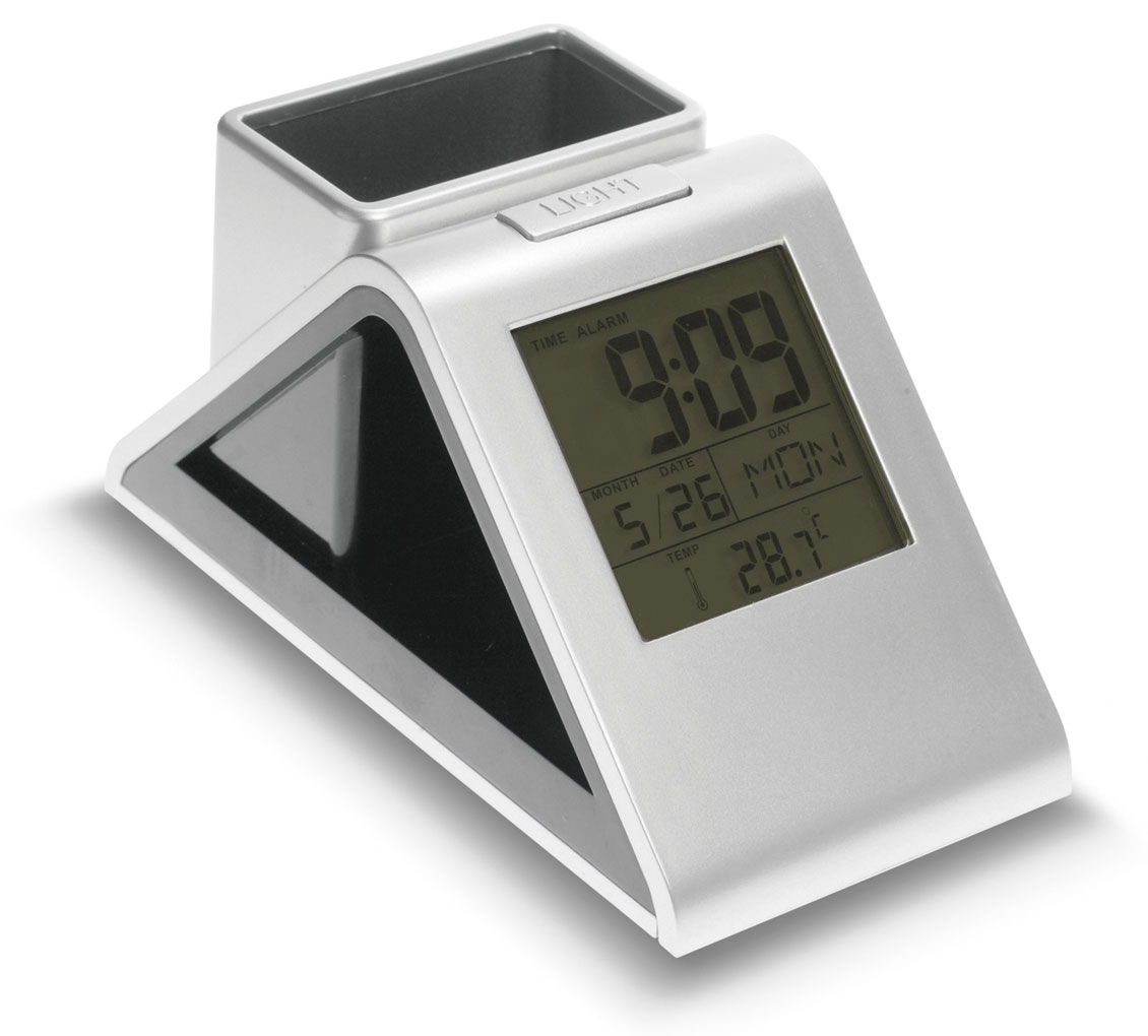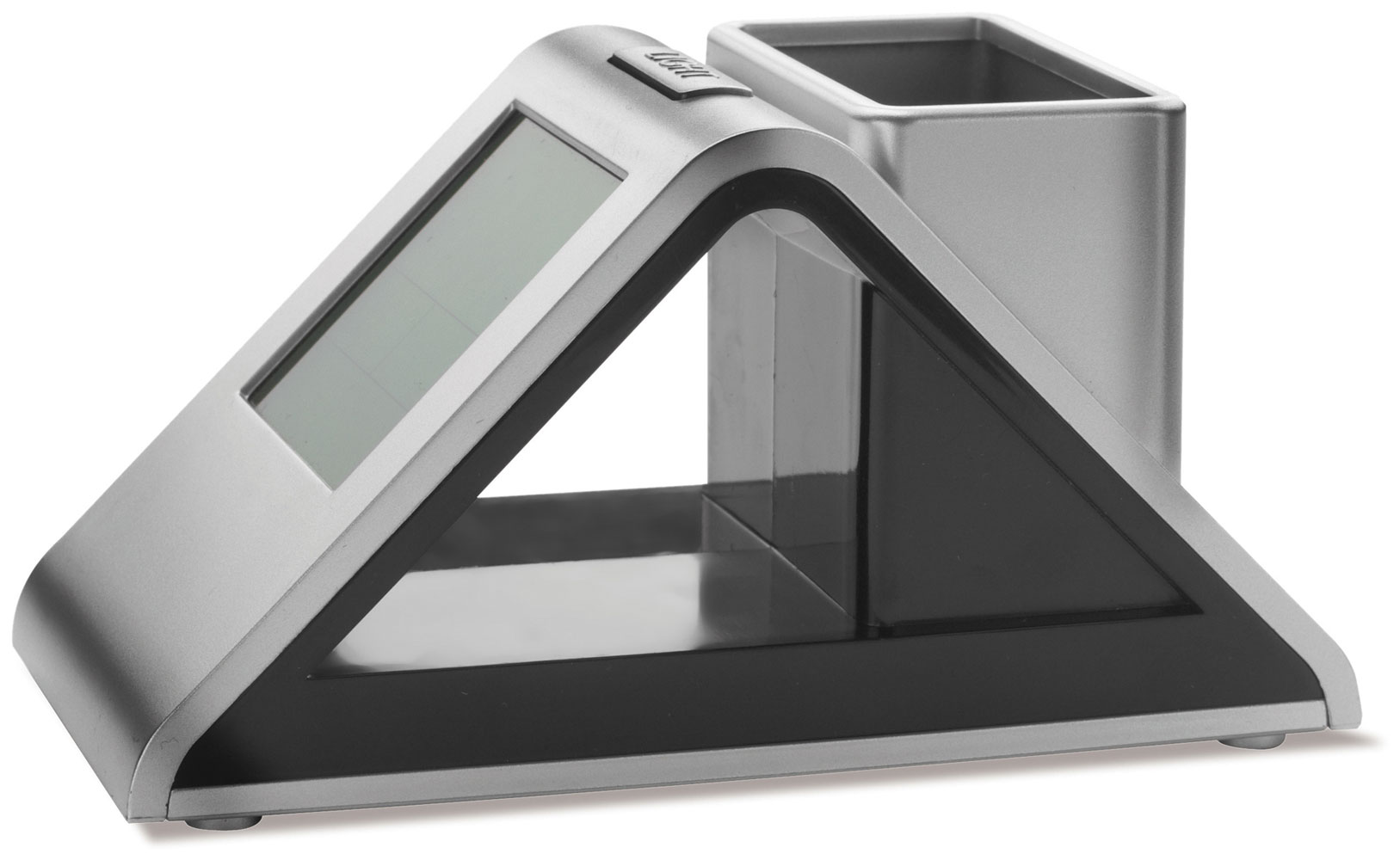 Suport pentru pix cu ceas. Este un accesoriu de birou util şi elegant în acelaşi timp. Acest produs are următoarele funcţii: mod de afişare ceas 12/24 ore, 9 tonuri de alarmă, alarmă cu snooze, memento ziua de naştere, termometru, cronometru, şi se afişeazăsi ziua săptămânii. Lumina ecranului este in culori alternante, neutru, roşu, albastru sau verde. Produsul este de culoare argintie cu finisaj mat, din material plastic. Setul conţine baterii de probă şi este aşezat în cutie individuală.