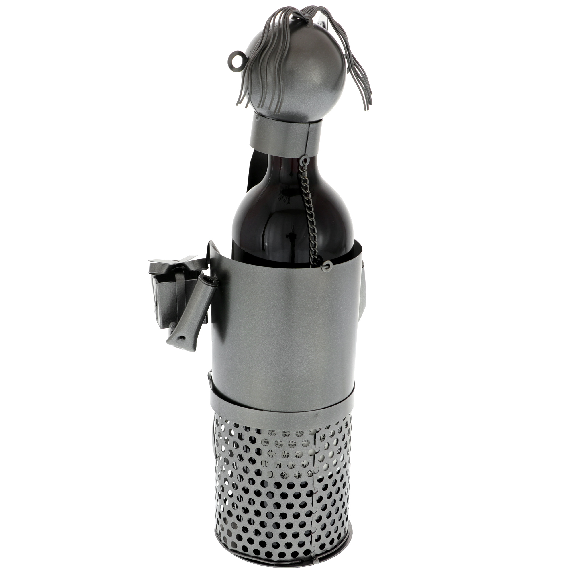 Suport metalic cu sticla de vin, un cadou special pentru aniversare de 40 de ani. Suportul realizat din metal de culore gri are forma unui om care tine un cadou intr-o mana si o tablita cu cifra 40 in cealalta. Sticla de vin inclusa este unul rosu, sec, Chianti, imbuteliat in Italia, 750 ml. Dimensiuni suport cu tot cu sticla - 10x15x34 cm. Personalizarea cu mesaj se face prin aplicarea unei placute gravate pe spatele suportului.