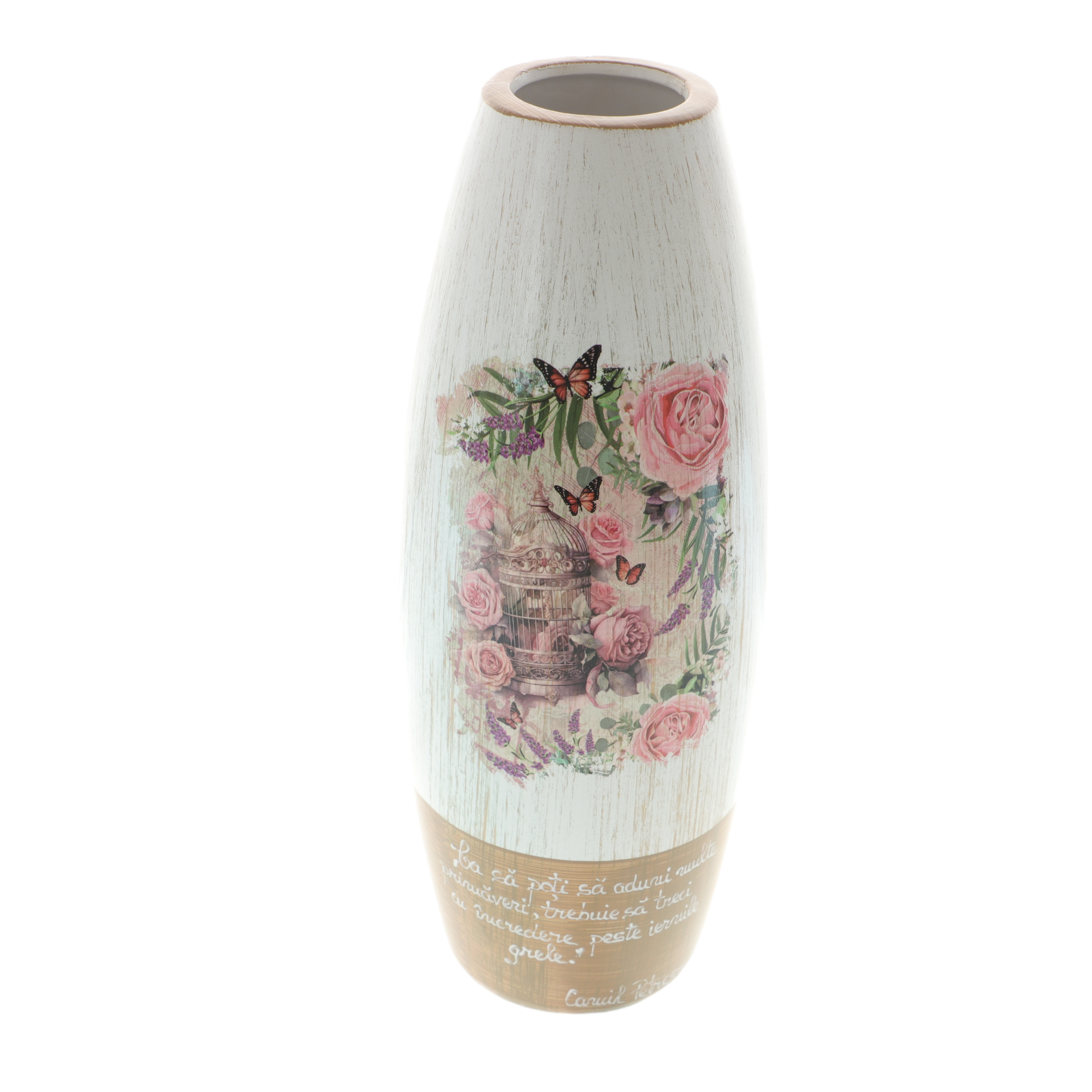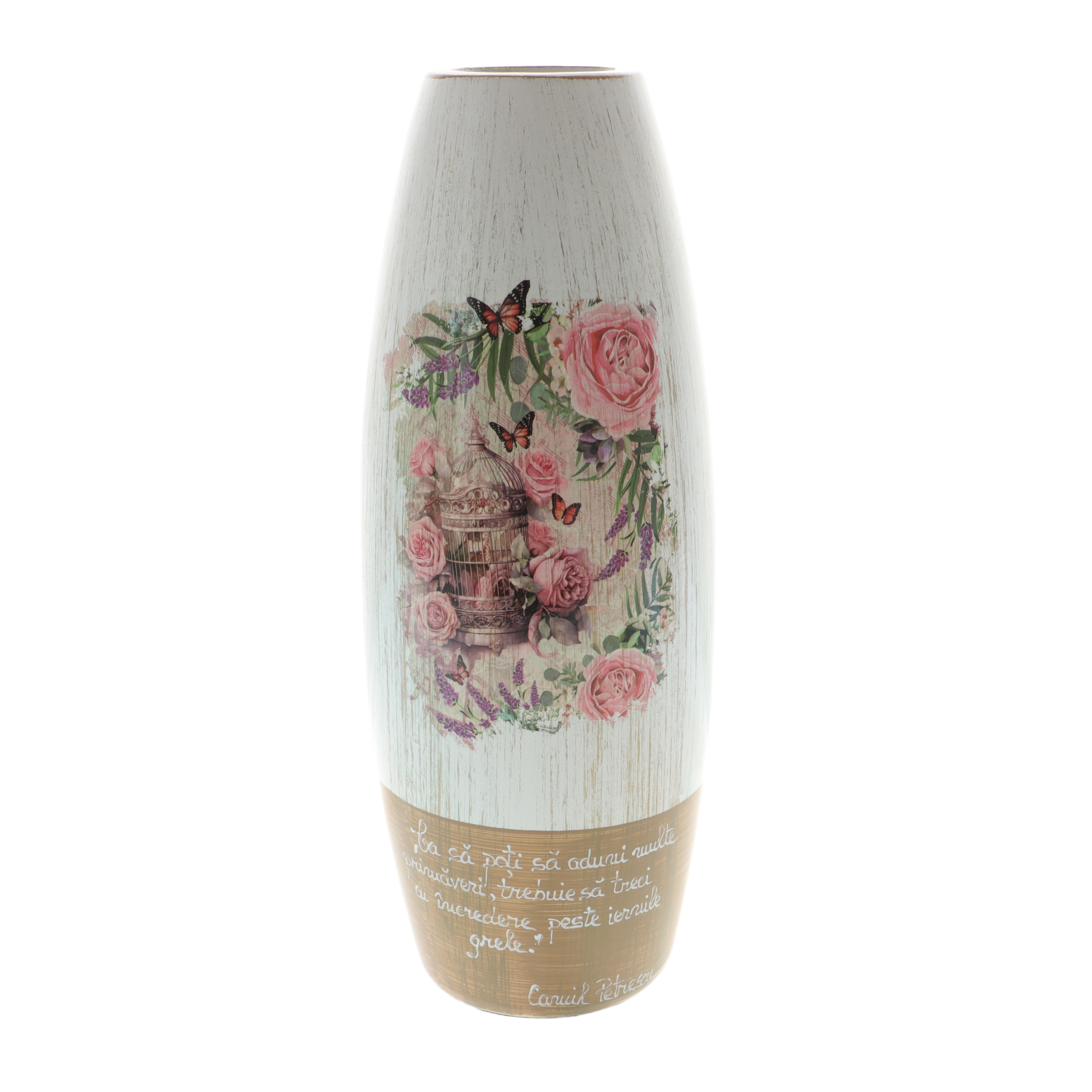 Adaugă un plus de eleganță și emoție oricărui spațiu cu această vază ceramică decorativă, realizată în stil vintage, perfectă pentru cadouri speciale sau decor interior rafinat. Designul delicat îmbină nuanțele de alb cu accente aurii la bază, fiind completat de un superb model floral cu trandafiri roz, pictat pe partea frontală.